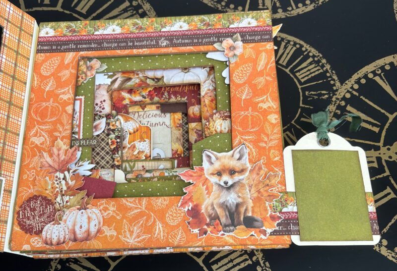 Page 3: To create the patterned paper piece on the tag, I chose one of the 3×4 cards and used the ATC die to cut it out. The backside of the tag as you can see in the second picture, I added a 2” x 2 ¾” photo mat out of the green solid paper. The other changes made were the fox image on the inside left of the flip out from the ephemera package, the small single flower in the top right corner also out of the ephemera package. In the bottom left corner the images are out of the ephemera package and the I love Fall sticker is from the Cardstock Stickers. I also added some green ribbon to the top of the tag.