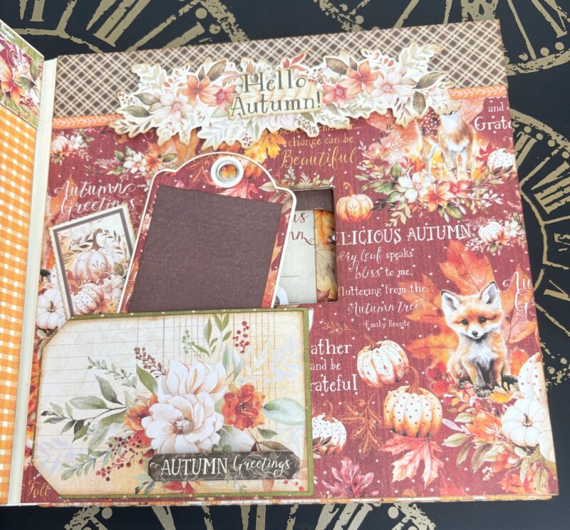 Page 9: I only made a few modifications to this page. I foam squared both the flower border strip and Hello Autumn sentiment out of the ephemera package to the top of the page. To create the patterned paper piece on the tag, I chose a piece of patterned paper and used the ATC die to cut it out. I also added the fox cardstock sticker to the front of the tag. The backside of the tag as you can see in the second picture, I chose a second piece of patterned paper and used the ATC die to cut it out. I added a 2 ⅛” x 2 ½” photo mat out of the brown solid paper to the backside of the tag. To the left of the tag, I adhered a stamp out of the ephemera package to the left of the ATC tag. The Autumn Greetings sentiment came from the chipboard package and I used foam squares to adhere it to the bottom of the floral tag.Â