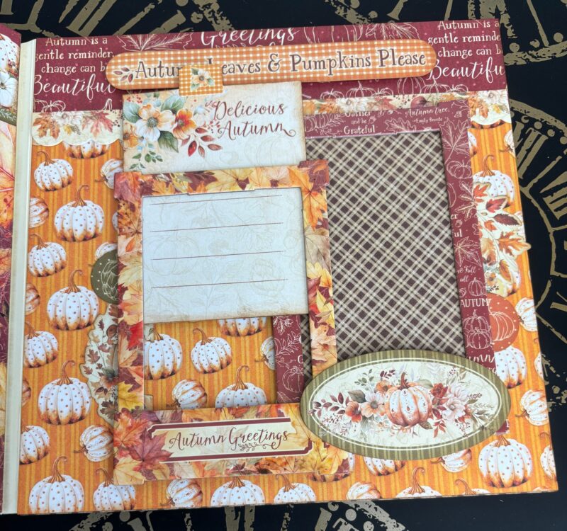 Page 7: I didn’t change too much on this page. As shown in the second photo, behind the frame with the deer on it, I added two photo mats that measure 2 ½” x 2 ⅞” from orange solid paper. I also added two small gold pearls to the frame. On the square frame, I added a single pumpkin out of the ephemera package as well as the Delicious Autumn cardstock sticker. In the top right corner, I added a small gold pearl to the tag, as well as added two leaves from the cardstock stickers. These two leaves I backed with burgundy solid paper.