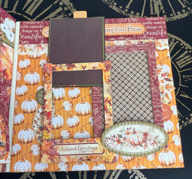 Page 10: I changed the flip open part slightly by adding a small pearl to the chipboard tag as well as adding a strip of patterned paper at the bottom of the flip open that measures ½” x 3” as well as adding a border strip that measures 1 ¾” notched on the left side and the pumpkins please cardstock sticker. In the second photo, it shows the photo mats that measure 2 ¾” x 3 ¾” out of orange solid paper. To the left of the flip open, I added the large pumpkin bunch, brown circle with acorns and a single green acorn out of the ephemera package. I added medium gold pearls to the Autumn Greetings chipboard sentiment, which I backed with brown solid paper. Behind the chipboard sentiment, I added a variety of leaves and an acorn bunch out of the ephemera package.