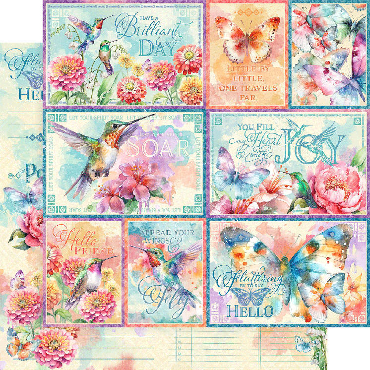 Dive into the enchanting world of Flight of Fancy, a captivating paper collection by Graphic 45 that takes inspiration from the graceful beauty of the delicate wings of hummingbirds, the ethereal flutter of butterflies, and the lush petals of flowers in full bloom. Transport yourself to a whimsical realm where the watercolor jewel tones reign supreme, with shades of blue, green, pink, and purple casting a spell of elegance and sophistication. Whether you’re creating handmade cards, scrapbook layouts, or mixed media projects, Flight of Fancy will elevate your crafting to new heights, inviting you to embark on a journey of creativity and imagination.