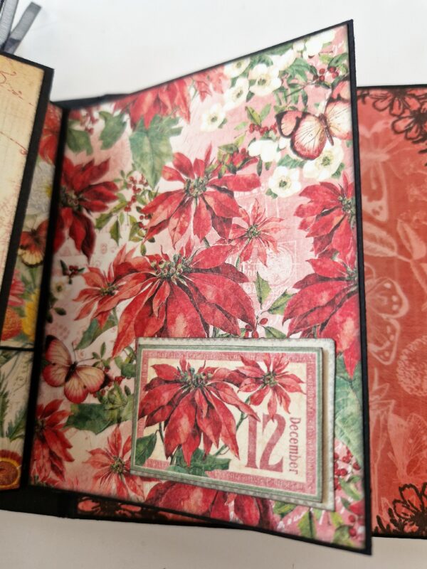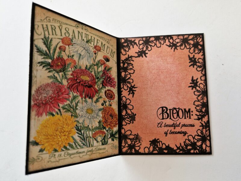 The last thing I did was to make some little inserts to go in the slots between the pocket pages. I cut four pieces of black cardstock at 6 1/8 (width) x 4 ¼ inches (height), I folded these in half on the width and cut out each of the beautiful large flower images from the reverse of the 8 x 8 sheet. I glued these in month order onto the cardstock, three to each insert. I cut four pieces of plain solid and once again stamped around the edges and added a stamped sentiment to create some interest.