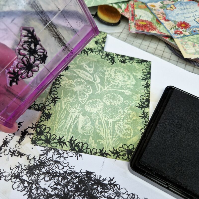 After this I took my Graphic 45 stamps and black inkpad and stamped a border around the outside of the edges of the patterned papers.