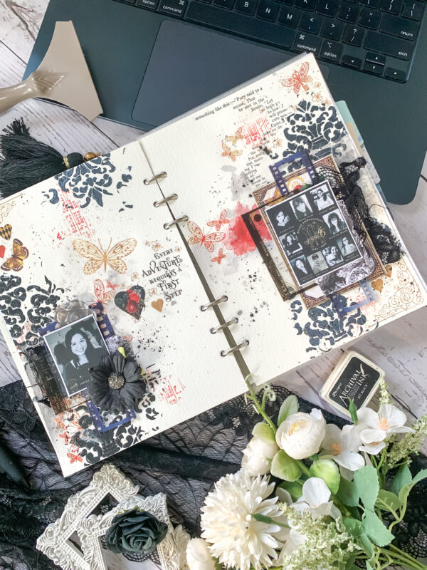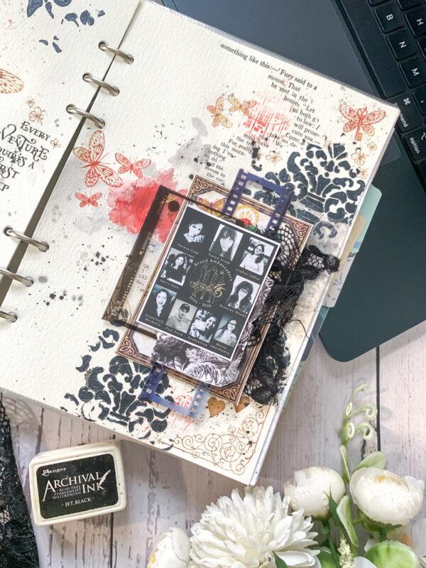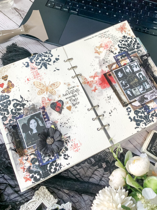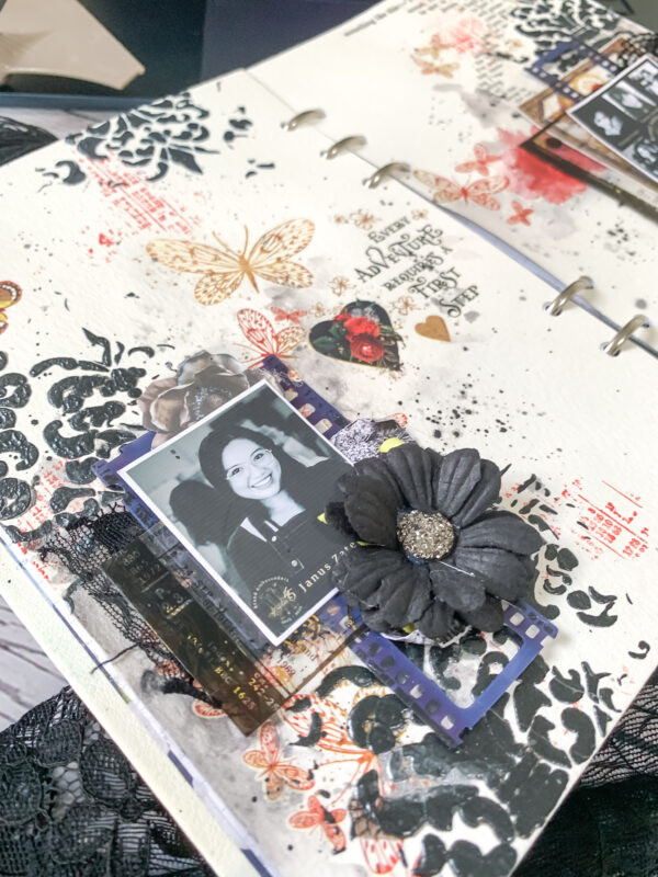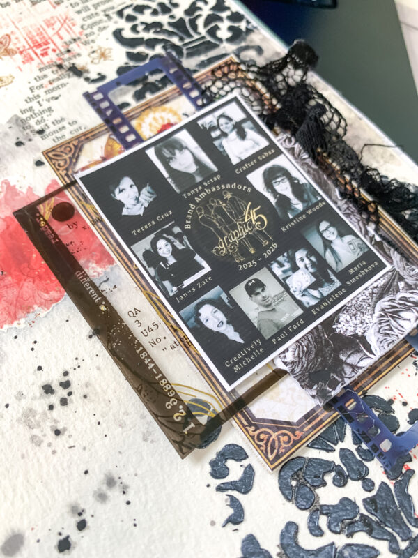To finish it off, I added some layered paper bits, black lace, and used black-and-white photos to match the aesthetic. This marks a special little moment, getting to be a part of the Graphic 45 Design Team!