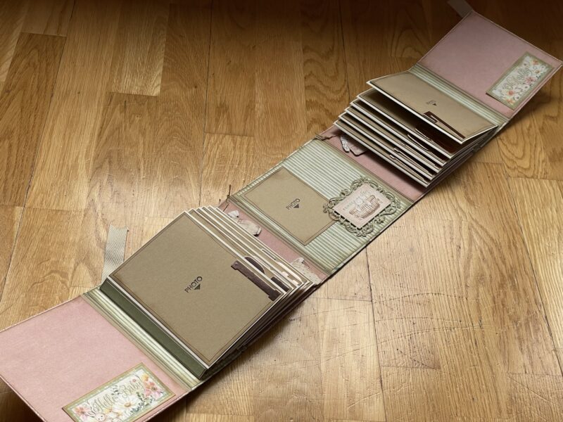 “Hi! I’m back and this time I made an album for you with a hidden shadow box 8 x 8. When you start unpacking this album you will end up in front of a shaker double door and opening it reveals a shadow box where you can place the most important photo of them all.