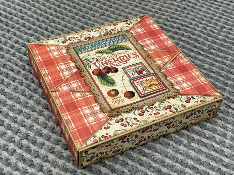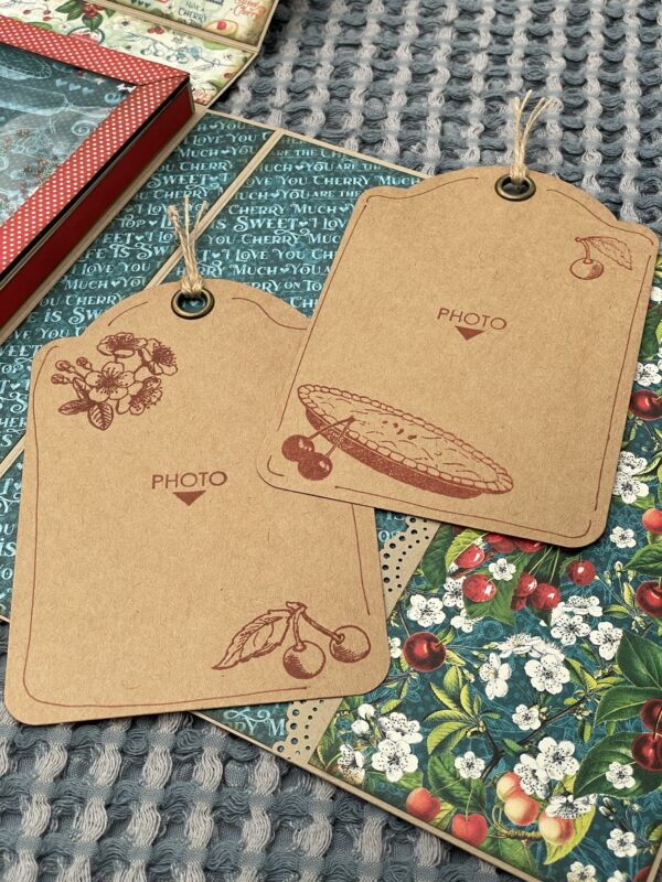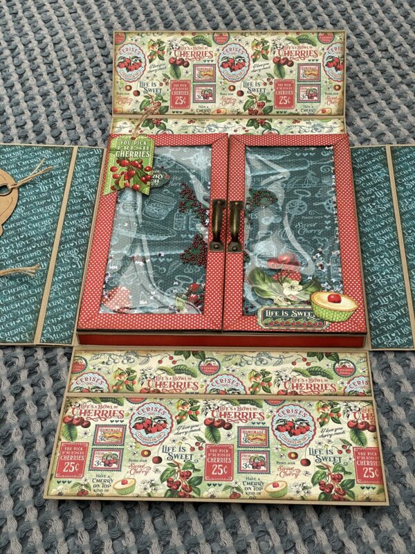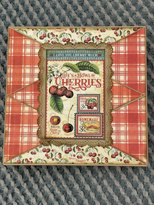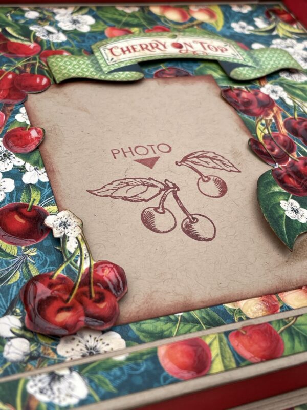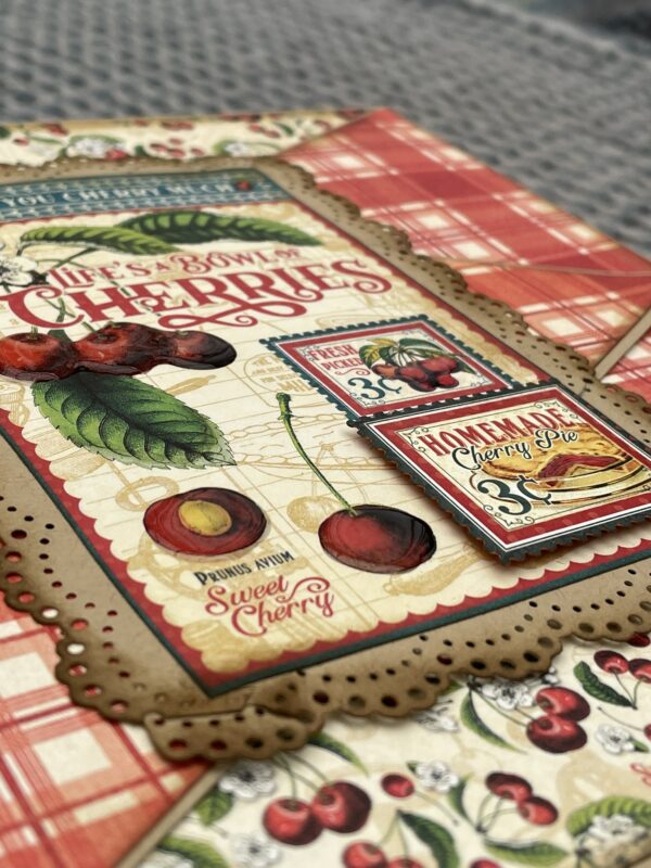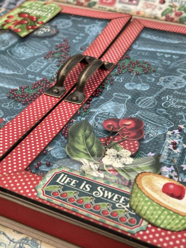 I have used the paper, Life’s A bowl of cherries, that is absolutely stunning and so cute to use in an album with photos of your loved ones. Or maybe as a recipe box or book. All of the cherries in this paper make me so happy. But I dont like to eat dem 🙂 only love to look at them.