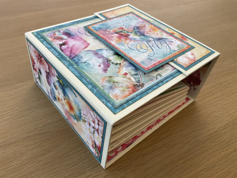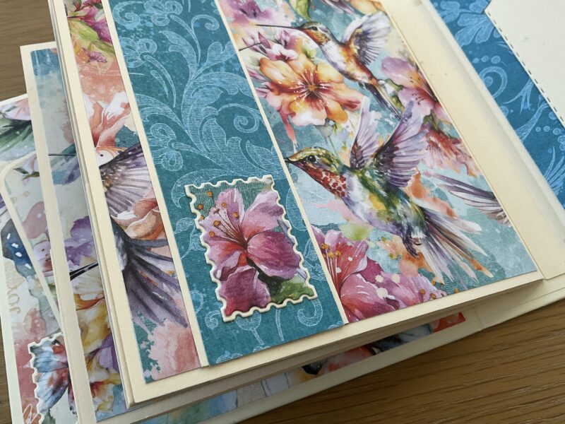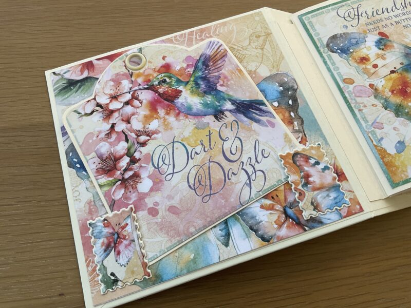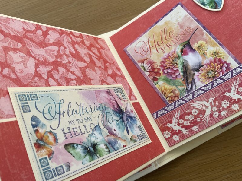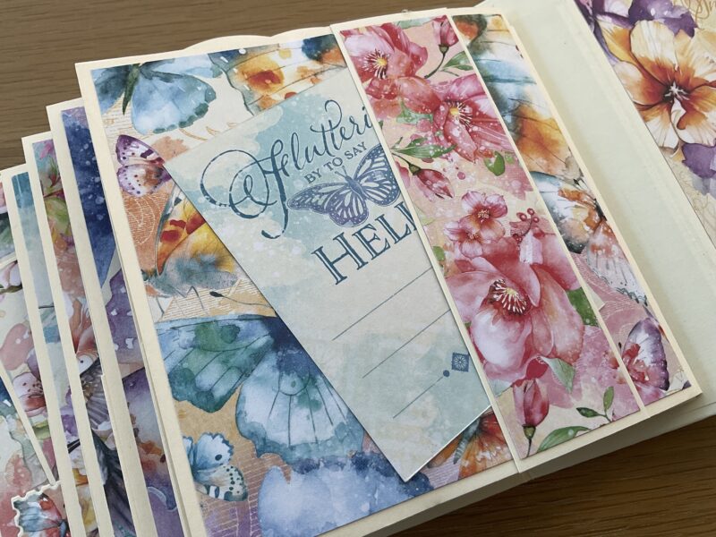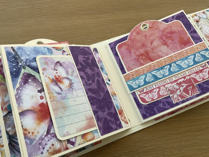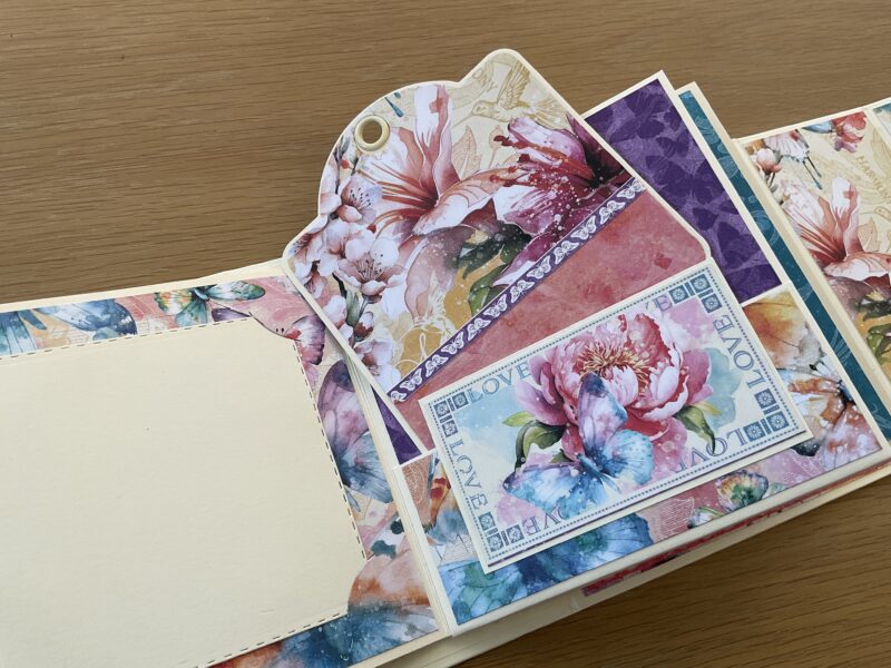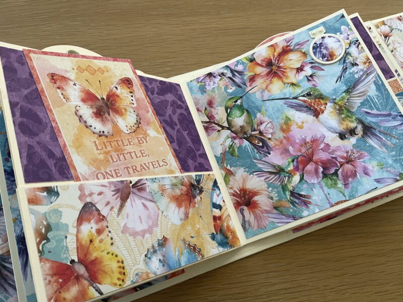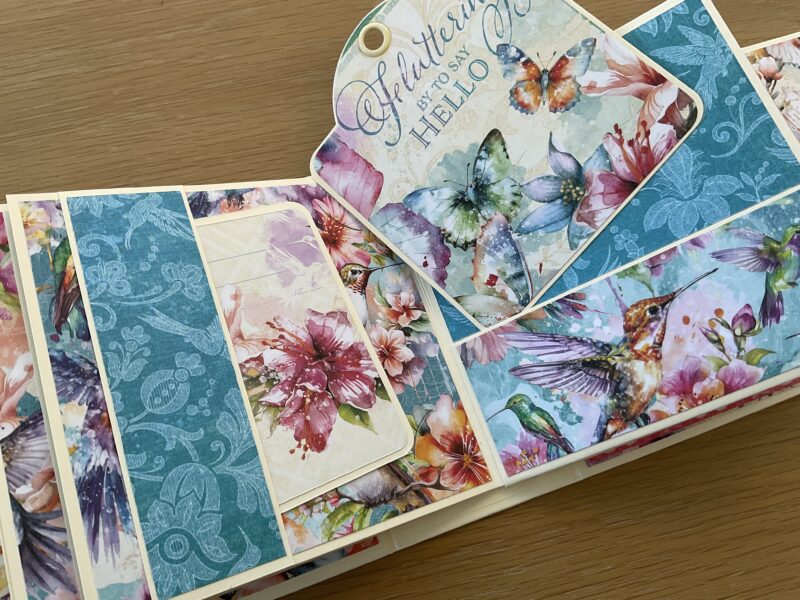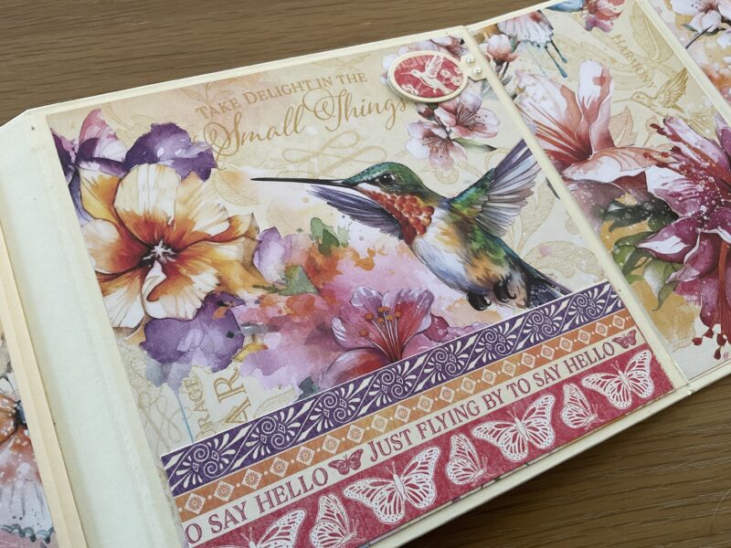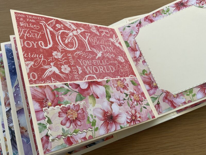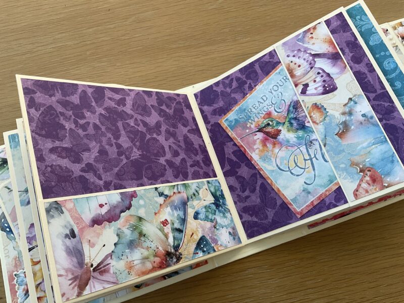 “Hi everyone. Paul here for my next G45 assignment which is a reel. I thought I’d have a go at covering the Square Tag & Pocket Wrap Around Album.The reel gives you the basic measurements to cover this album in your favourite Graphic45 papers. This is such an effective album and so simple to decorate. I used Flight Of Fancy as I love the colours. It is just a bunch of 5 ¼” by 5 ¼” squares so you get 4 pieces from each 12×12 paper. I also share ideas for the leftover pieces.