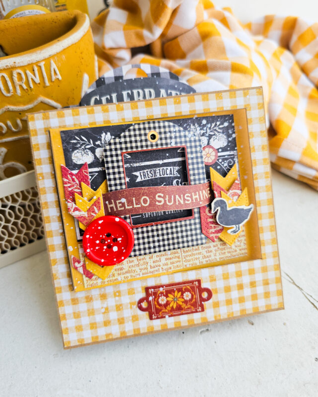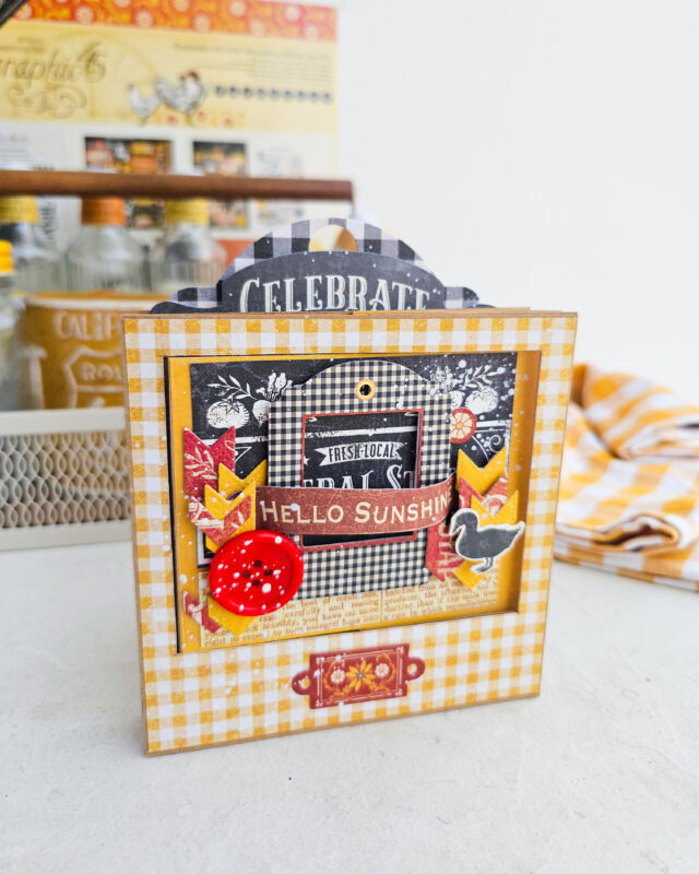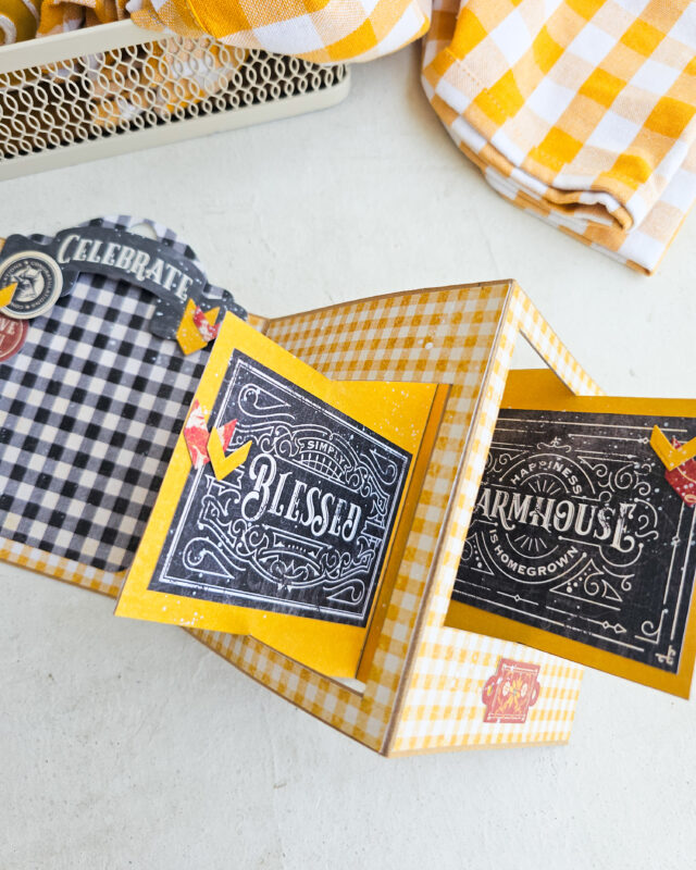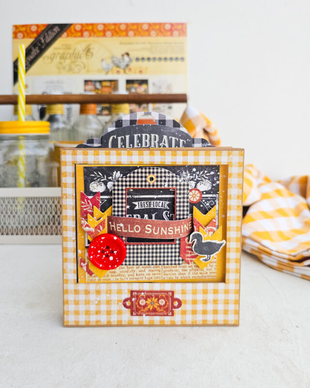 Embellishing with Graphic 45 Farmhouse! Now for the absolute best part: decorating! I used the gorgeous Graphic 45 Farmhouse papers to cover my panels and base. I added sentiments like “Blessed” and “Farmhouse” to the swinging elements, and “Hello Sunshine” to the front. Don’t forget those cute chicken laser cuts!