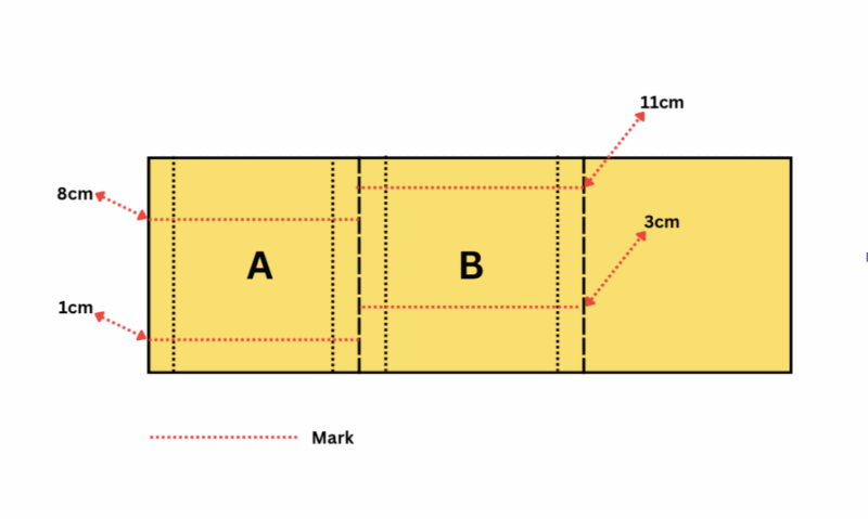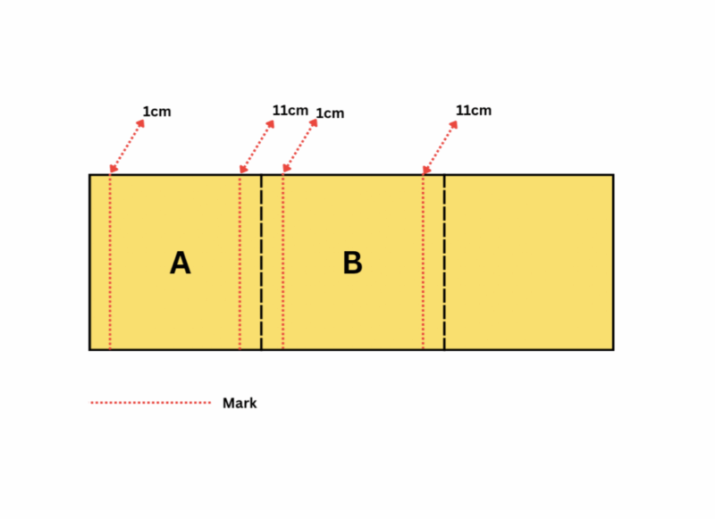 - In Part A and Part B, mark 1 cm and 11 cm from the top edge along both 36cm sides(longer side). Draw light pencil lines.