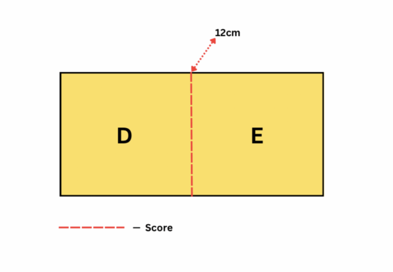 - Score it down the middle at 12 cm. This divides it into two equal parts: D and E.