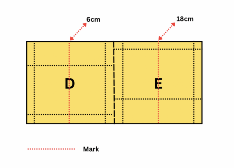 - In both parts D & E, mark 1 cm from the top edge and 11 cm from the top edge along both 24cm sides.