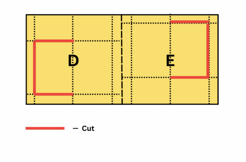 - Divide both Part D and Part E in half along their 12cm side (the longer side of each half). You’re essentially marking a line down the middle of the “window” area.