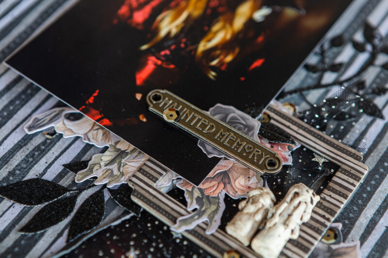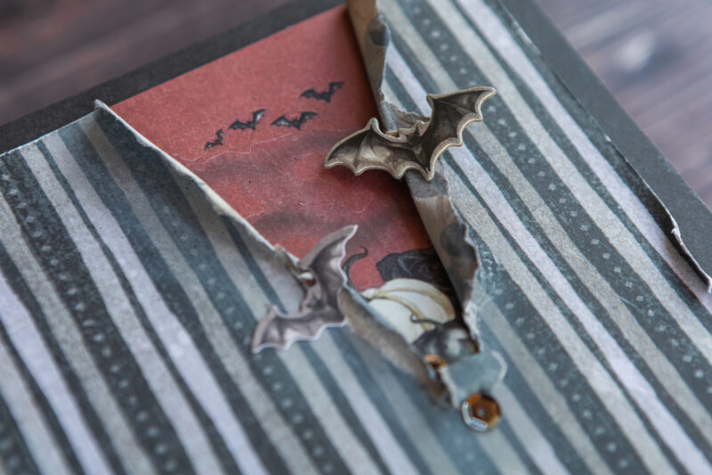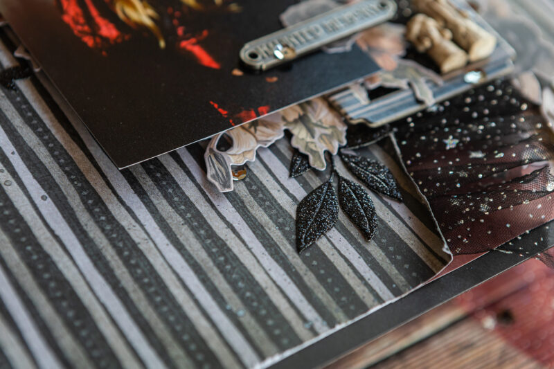 I started by layering and tearing papers from the Graphic 45 Ghostly Greetings collection, a little chaotic, but that’s the fun part. Some edges are distressed, and I left a few tiny gaps just to let the background breathe. I added Ephemera, Chipboard Pieces, Tags & Frames, and Rub-On Transfers, mixing them with my own die cuts, delicate branches, leaves, and a few spooky details.