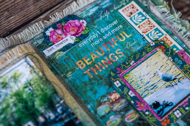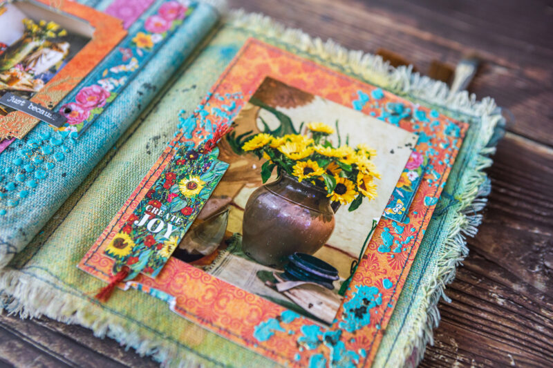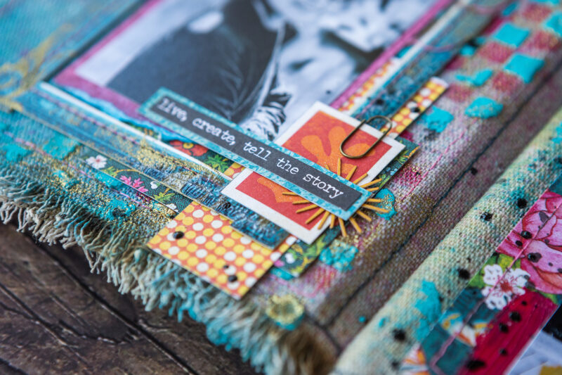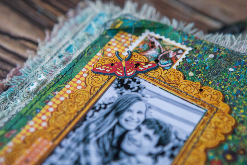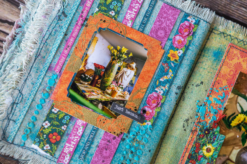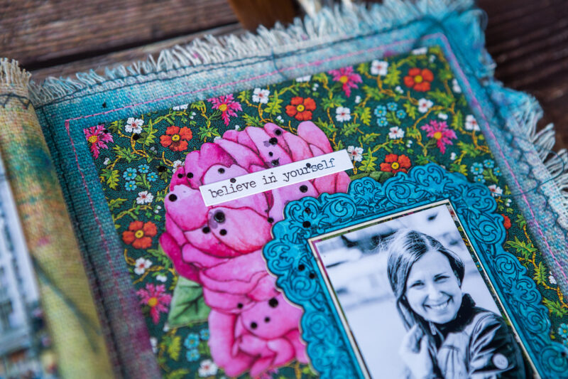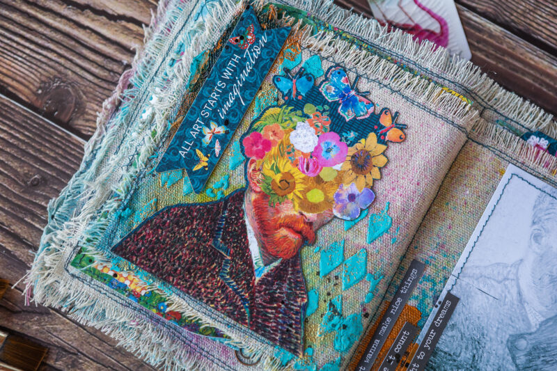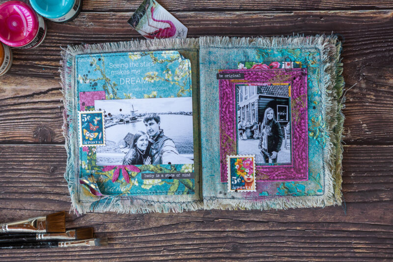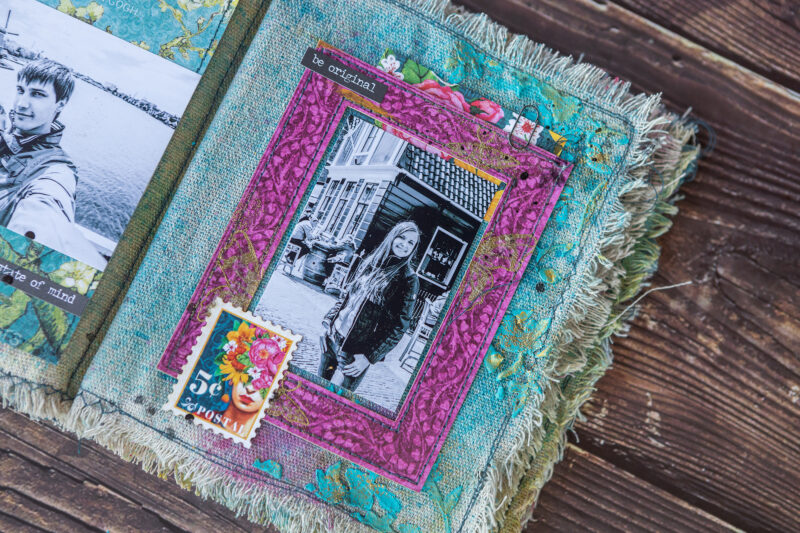 The base of my pages is fabric. Then I added color using sprays. I created the texture and background using acrylic paints, paste and embossing powder. I made some backgrounds from scrapbook paper strips. The main decorative elements in the album are the frames from Let’s Get Artsy Tags & Frames set which I decorated using stamps and embossing powder.