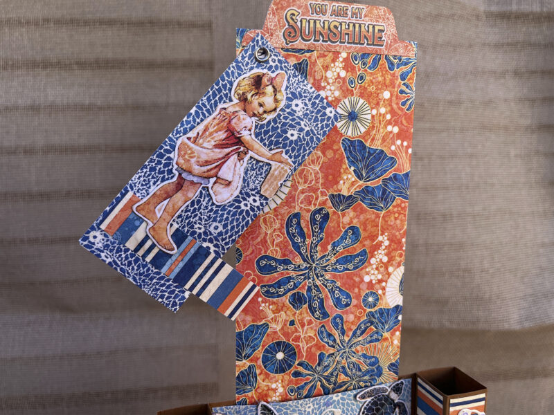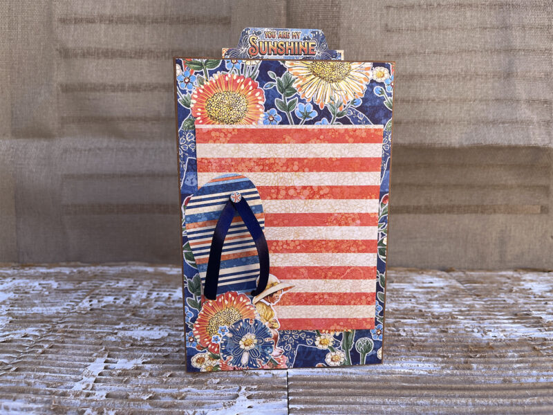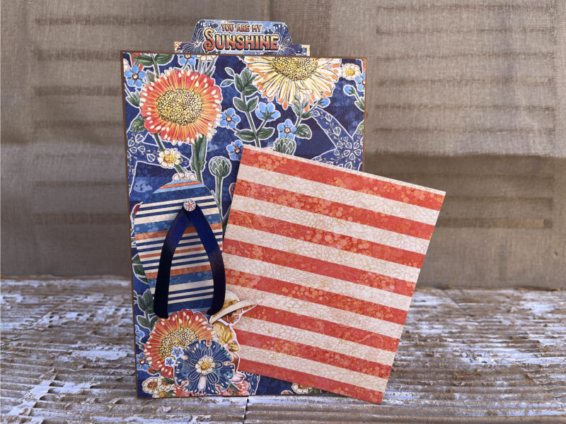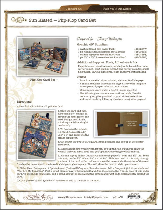 “Hello G45ers! Cecilia here and so happy to share with you this leveled up card inspired by Nancy Wethington. I loved so much two of the elements she designed for Graphic 45 card kit No. 07 – 2023 but I tried to create something with a twist: a pillar card that includes the cute flip flop on the back and the sliding panel as well but with space to make this a gift card. The finished card stays flat to put it inside of an envelope. I hope you like it and give it a try! so don’t miss the tutorial and tag Graphic 45 and me to see yours 🙂