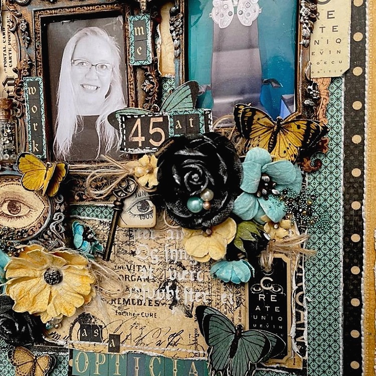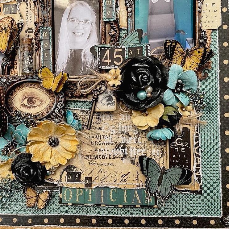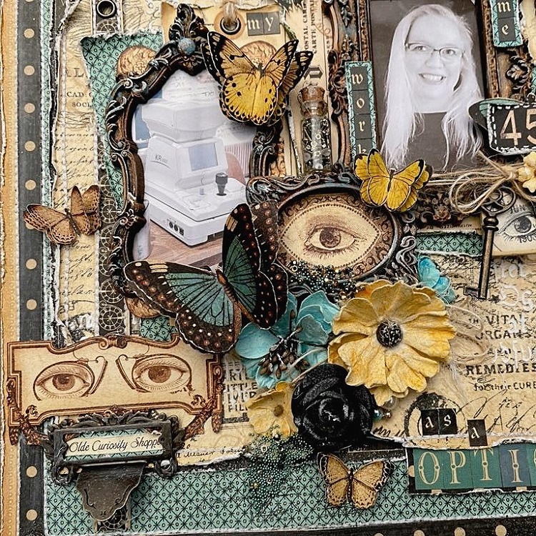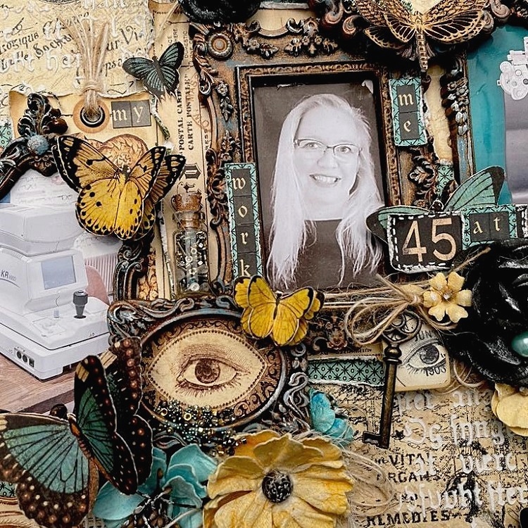 For this layout I used three pictures, one of me and two of my work place. I have worked as an optician since 2014 and love my job. Before that I also worked in an optic store {the same one} but I couldn’t measure eyes and i went to school to make that dream come true. The pictures are all in frames that I made with molds and treated with paints, ink and waxes.
