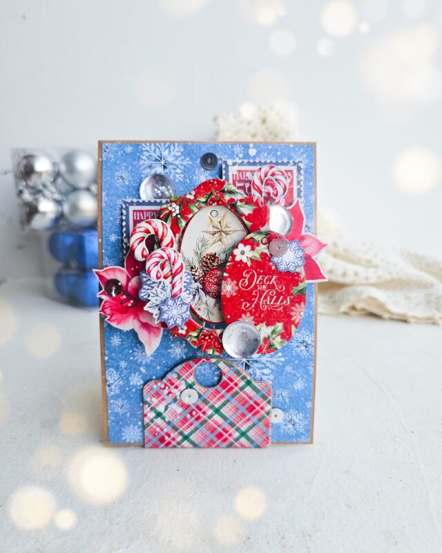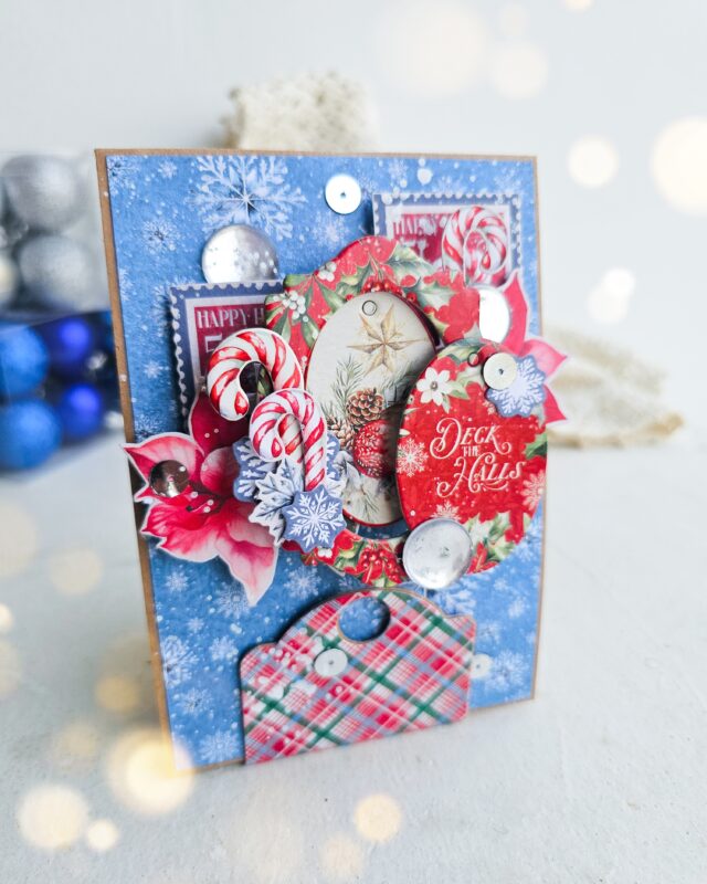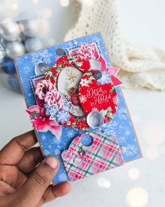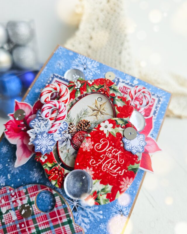 - Add ephemera, chipboard, candies, poinsettias, snowflakes — festive chaos encouraged!