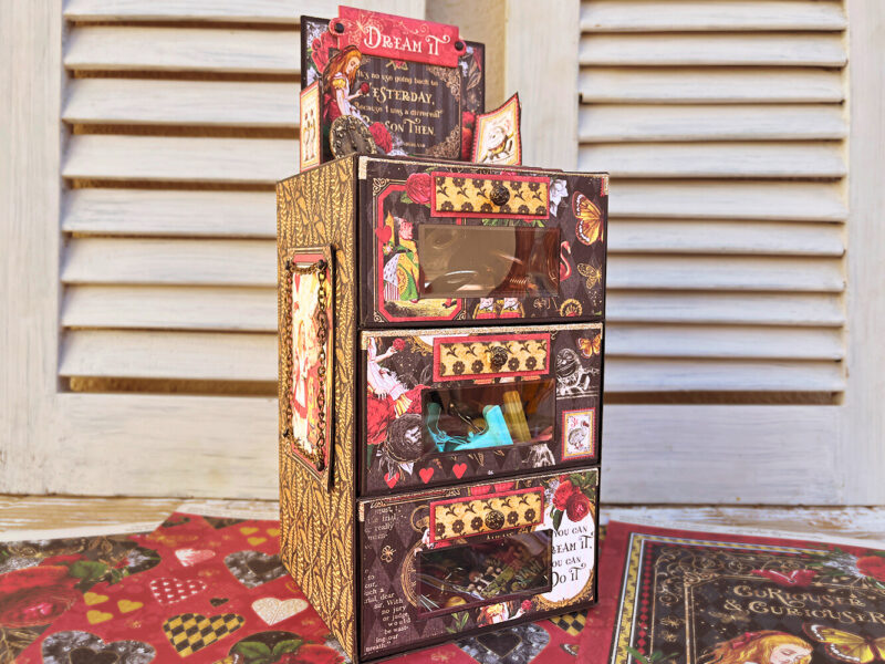 Are you ready to start the new year with a creative boost and an organized craft space? Today, we’re thrilled to feature a stunning DIY storage solution crafted by the talented Scrapbooking Cecilia aka Cecilia Zertuche. Using Graphic 45’s whimsical Curiouser & Curiouser paper collection and Chipboard Sheets, Cecilia designed a gorgeous set of storage drawers perfect for organizing your embellishments, trinkets, and crafting essentials. This fun and functional project doubles as home decor and a burst of inspiration for our January #G45CraftStorage Challenge! Follow along with Cecilia’s video tutorial on YouTube and let’s transform your workspace with a touch of handmade magic.