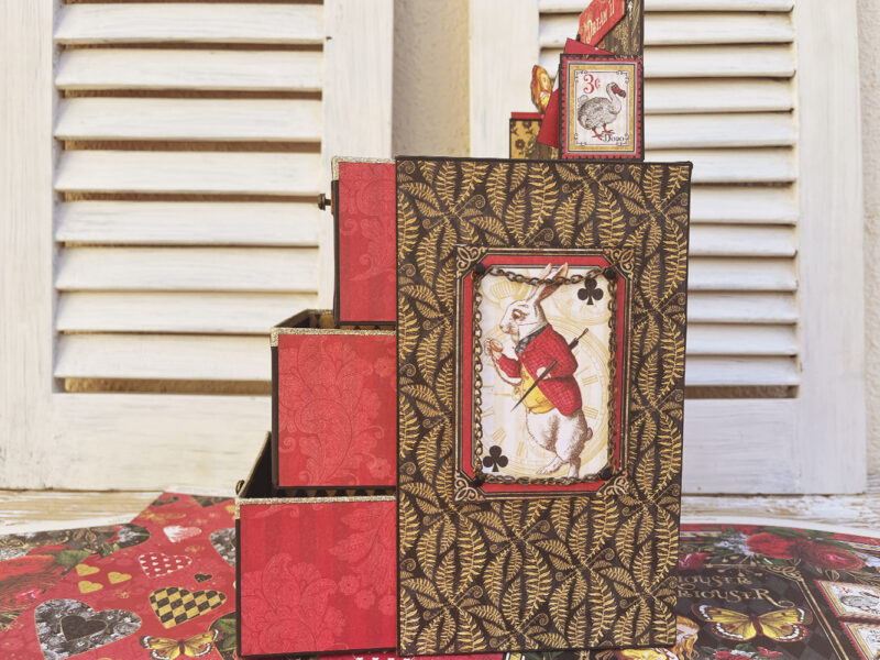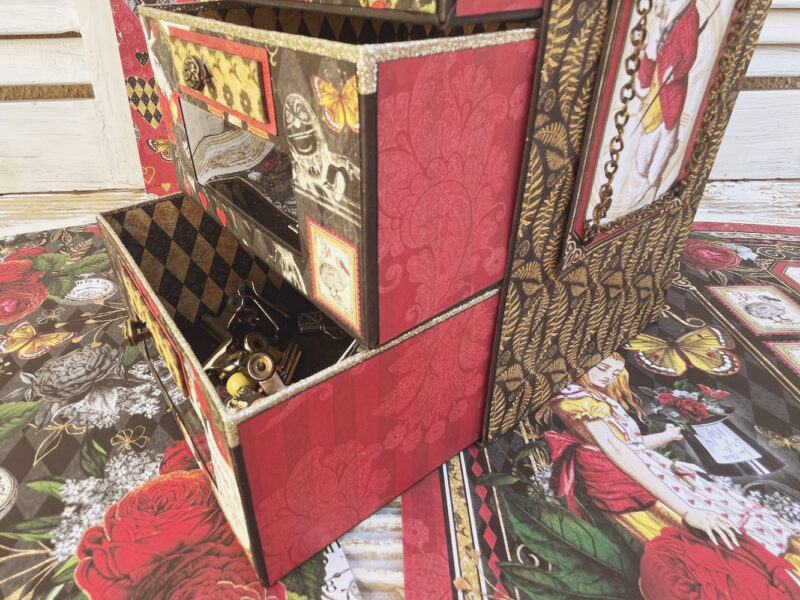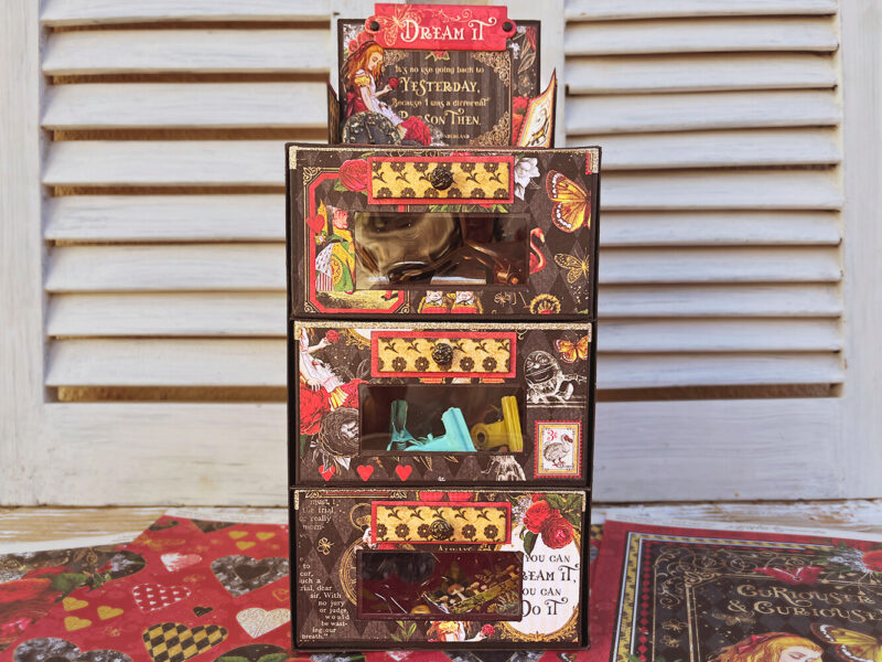 “Hello G45ers! Cecilia here sharing with you one of my craft storage solutions. I needed a storage tower with drawers to keep organized all my clips and small things needed when crafting and as my working table is not too big I prefer to take advantage of making tall storage items. As you can see I used the stunning Curiouser & Curiouser new paper collection by Graphic 45 because I LOVE IT! and I always want to keep what inspires me the most in front of me so my handmade storing boxes are made with my favorite collections. I hope this will like you and works for you in your craft room and if you feel inspired by this project and make your own tag me! and tag Graphic 45 as well! We love to see what you create. The tutorial is in Graphic 45 YouTube channel, XOXO Cecilia.