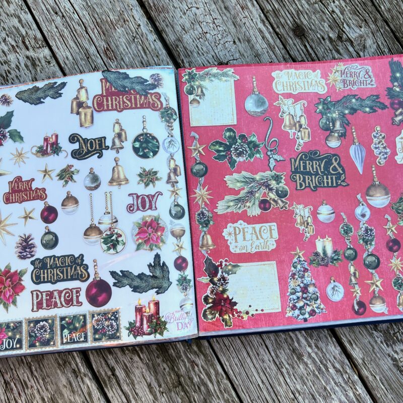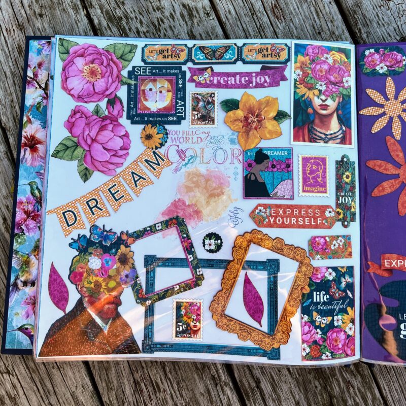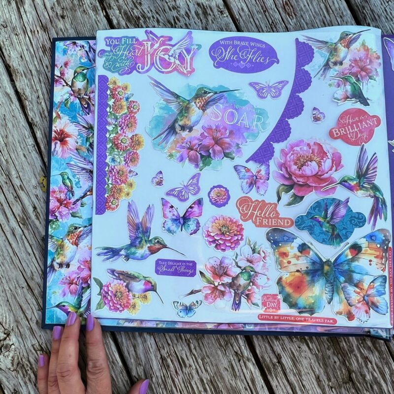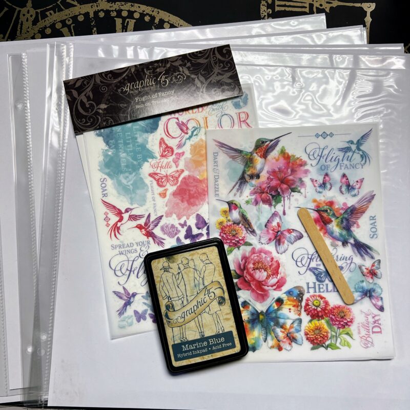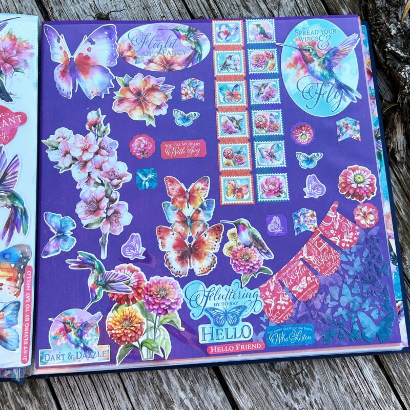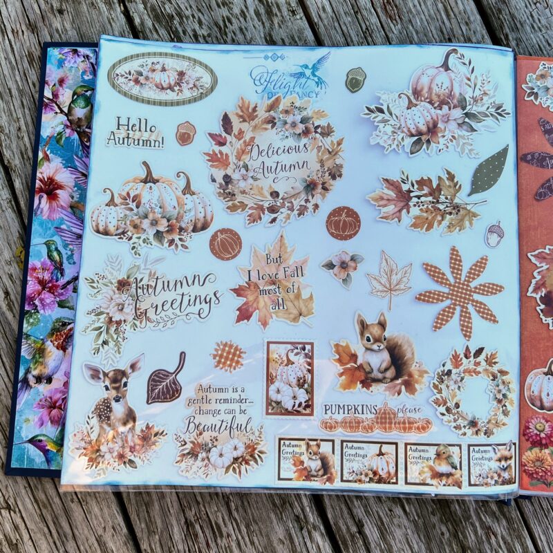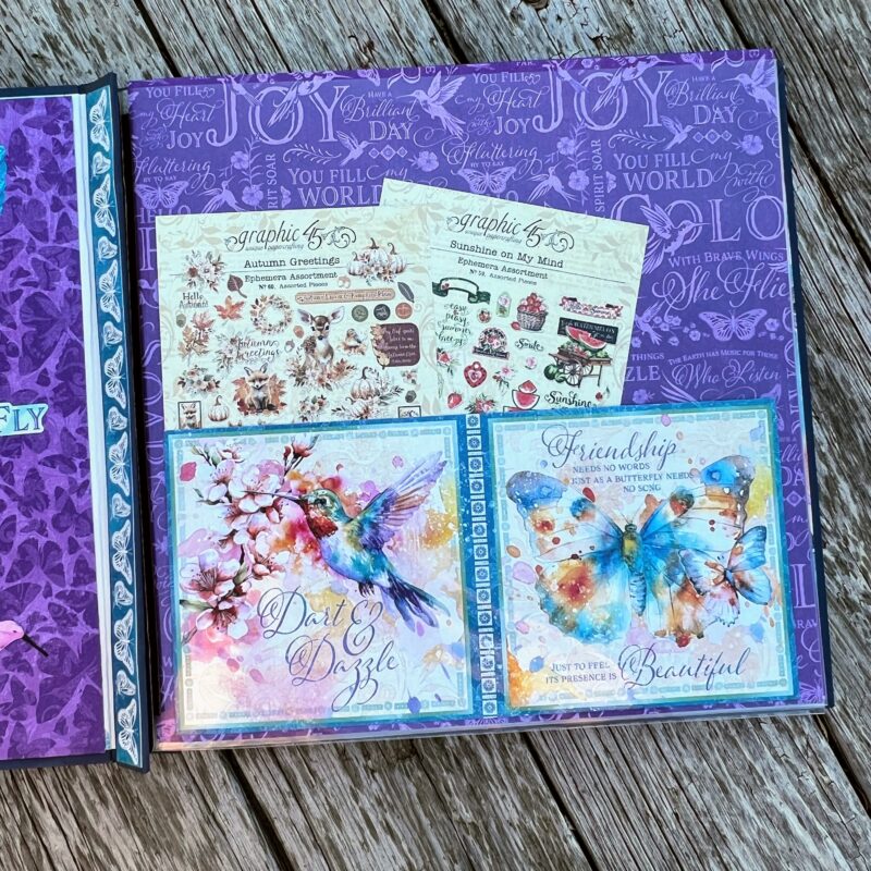 I organized my ephemera sets in a 12″ by 12″ Scrapbook Album and decorated the cover and inside using the Flight of Fancy Paper Collection.