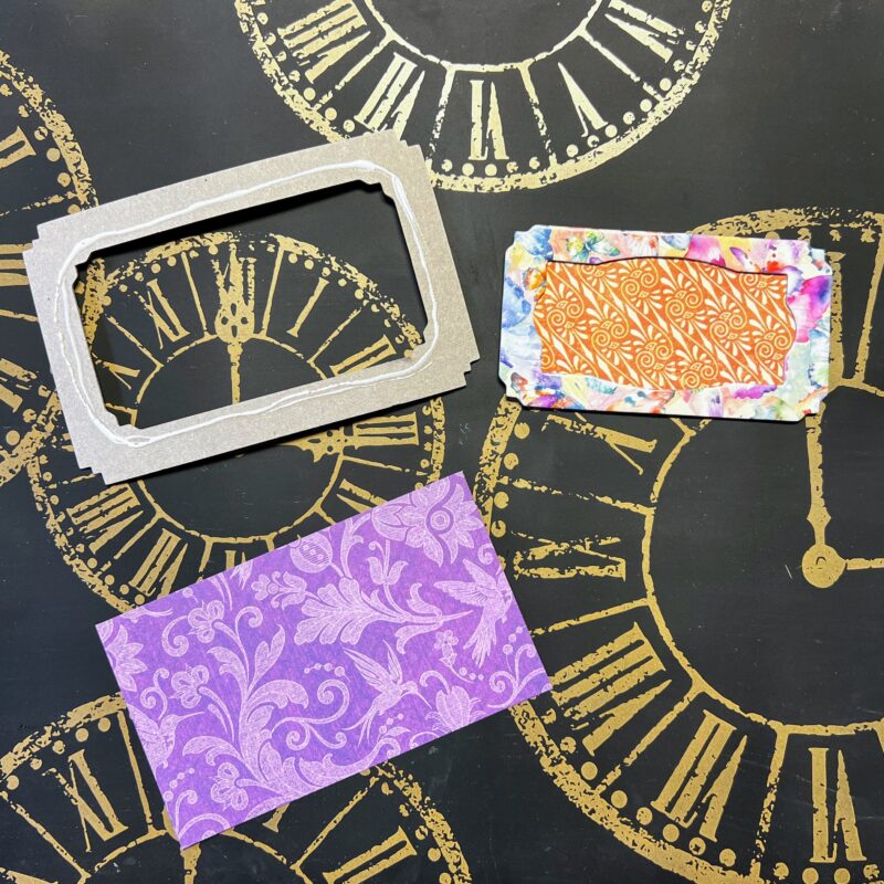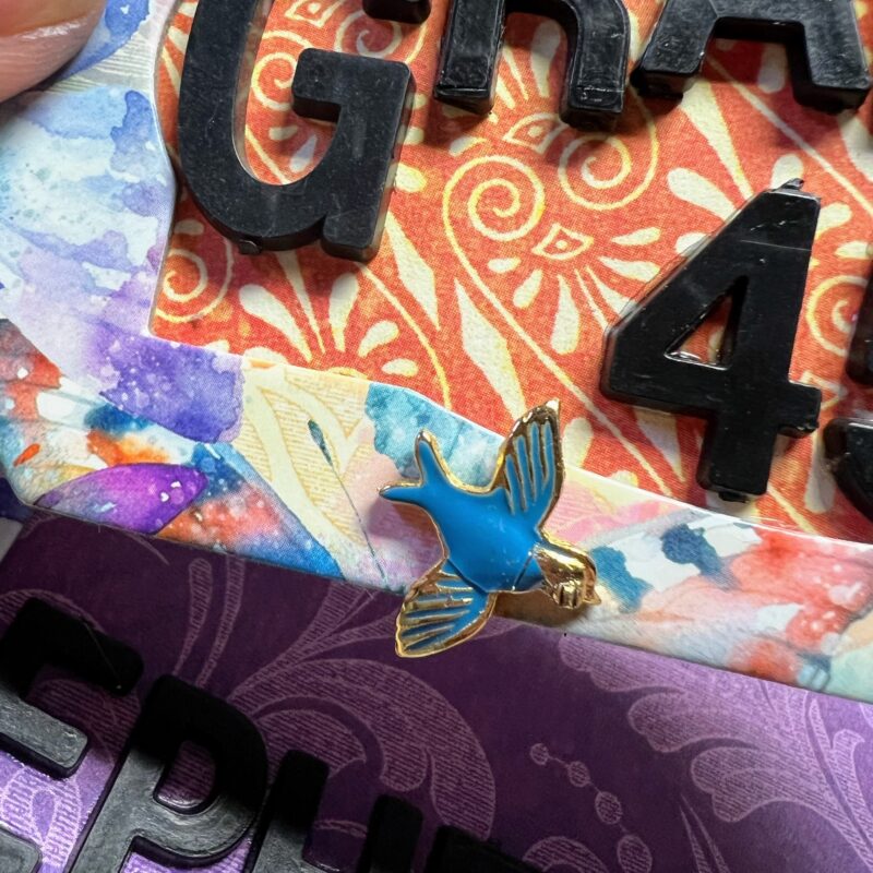 I added pattern paper to the back of my frames. Next, I added a bird charm to my chipboard. Then, I glued my letters on and made a few die-cut hummingbirds.