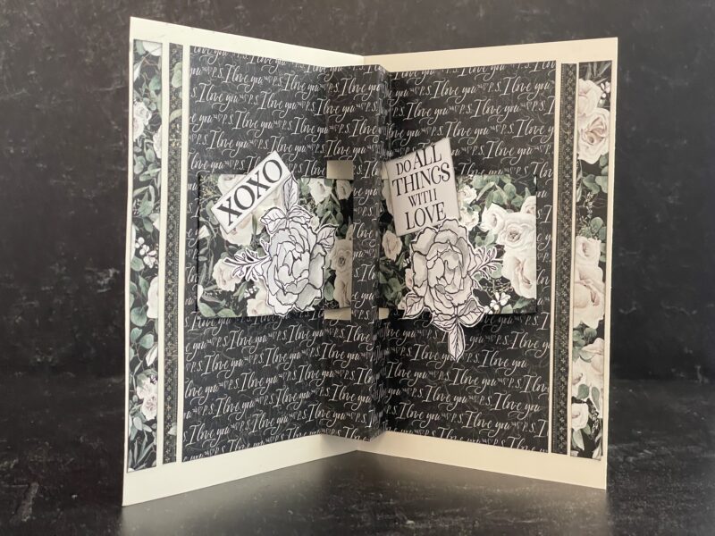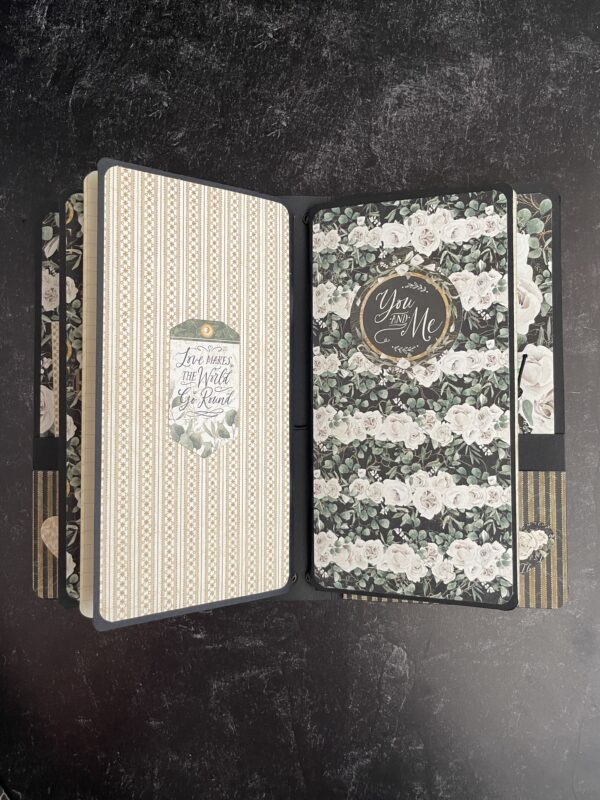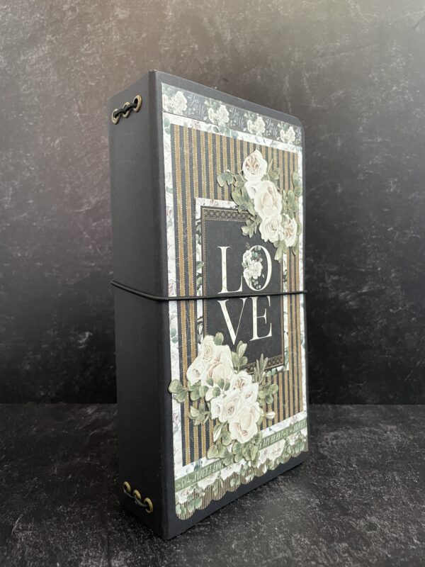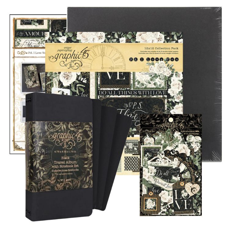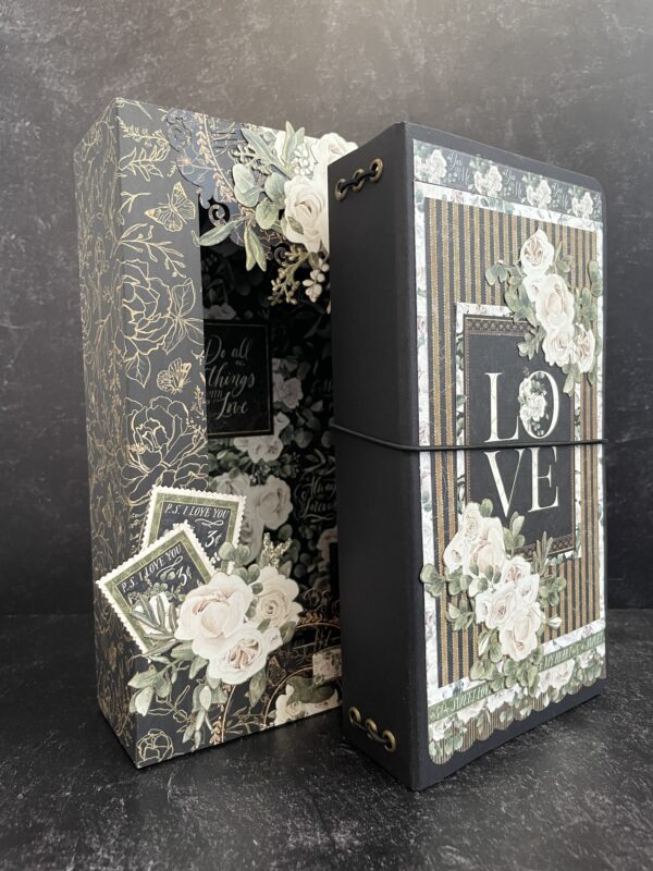Show your ultimate devotion with this easy-to-create yet elegant DIY Shadow Box, featuring the P.S. I Love You collection and Black Travel Album. From endearing sentiments to striking white florals, your most loved photos will be beautifully showcased. You’ll learn how to make this charming shadow box using chipboard sheets and basic folding techniques. It’s the perfect place to store your travel album or other beloved trinkets. You’ll also decorate the travel album and notebooks with some added pockets and oversized pull-outs.