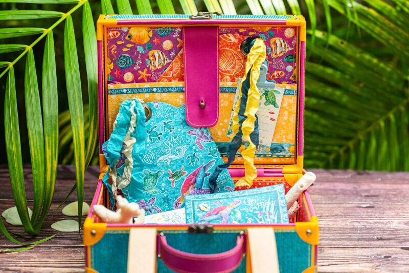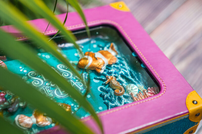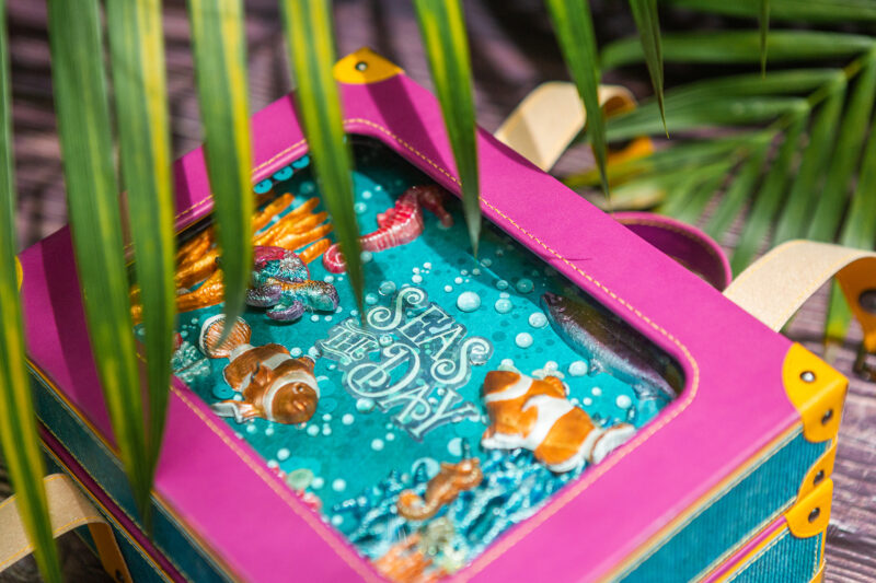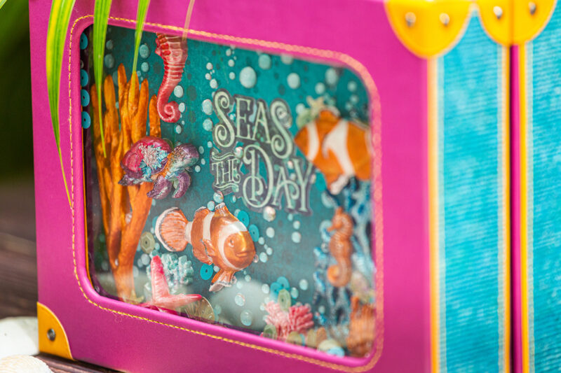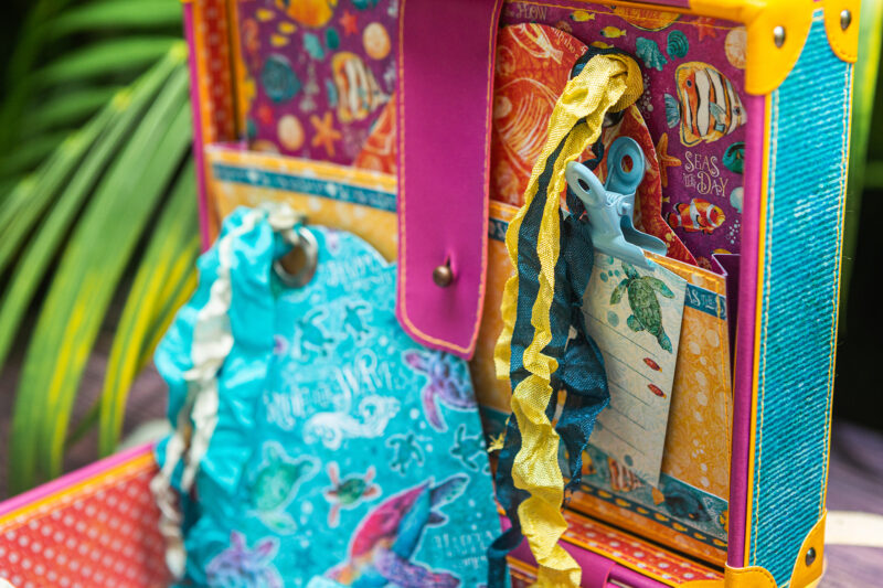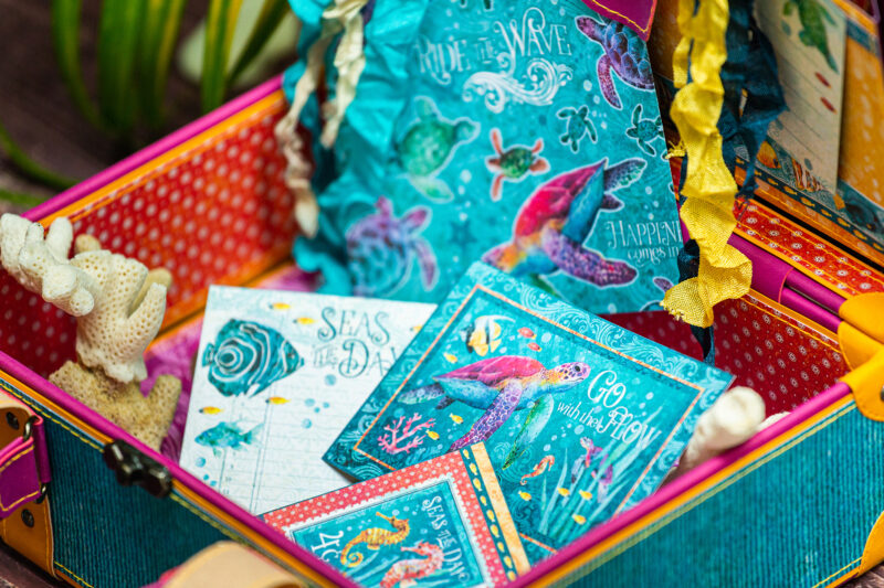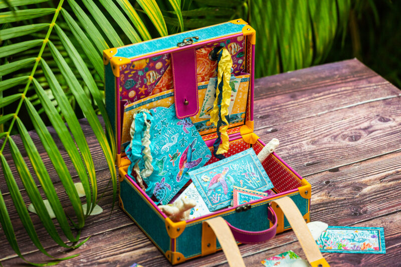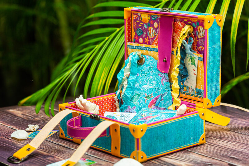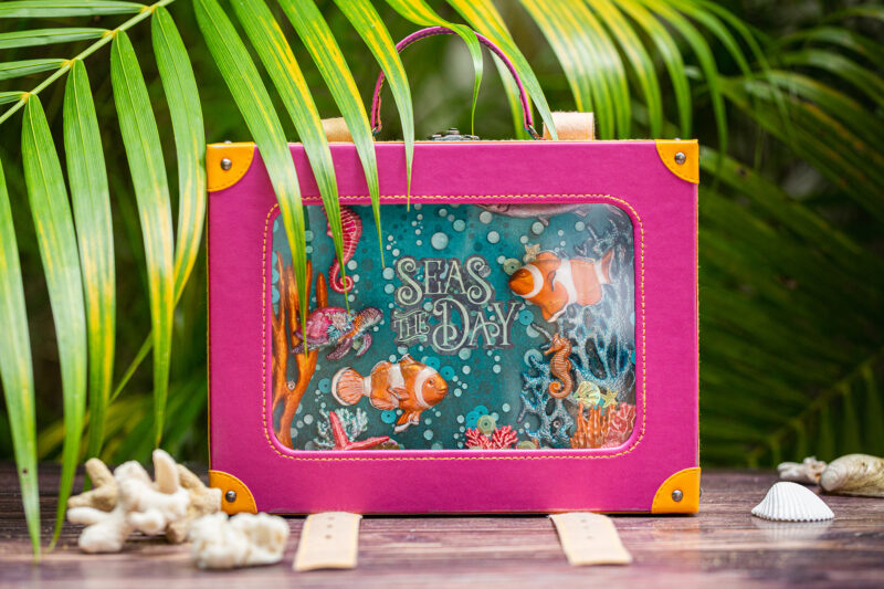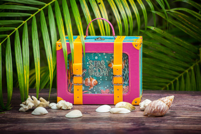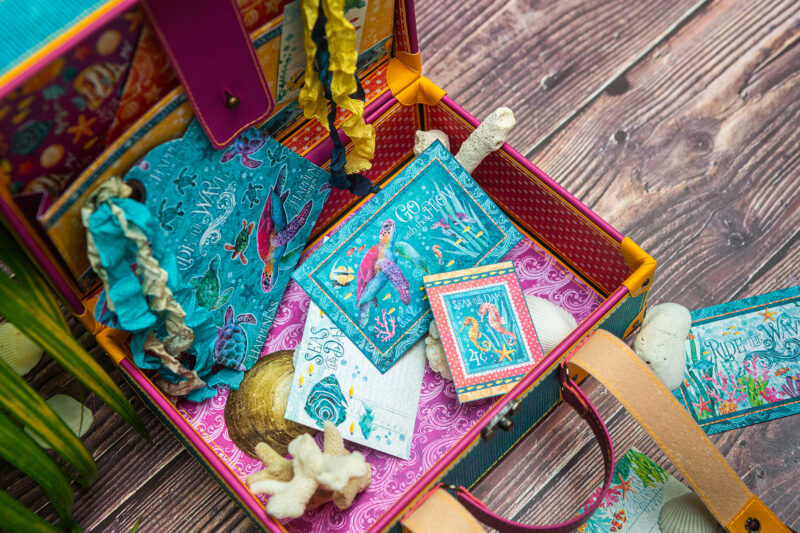 Today, I’m thrilled to share a project that has truly captured my heart — a handmade memory suitcase created with the vibrant and joyful Seas the Day collection. It is pure summer bliss. With its rich blues and turquoise tones, playful coral accents, vintage-style typography, and cheerful under-the-sea illustrations — turtles, seahorses, shells, and seaweed — it immediately sparks a wave of creativity. It doesn’t just tell a story, it invites you to dive into one.