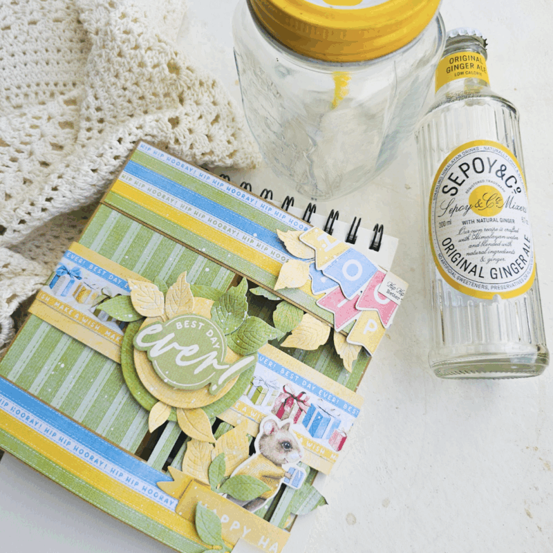 - Choose your favorite papers from the “Hip Hip Hooray” collection. I went for a mix of greens and yellows to give it a fresh and playful forest look! Cover all panels of your base.