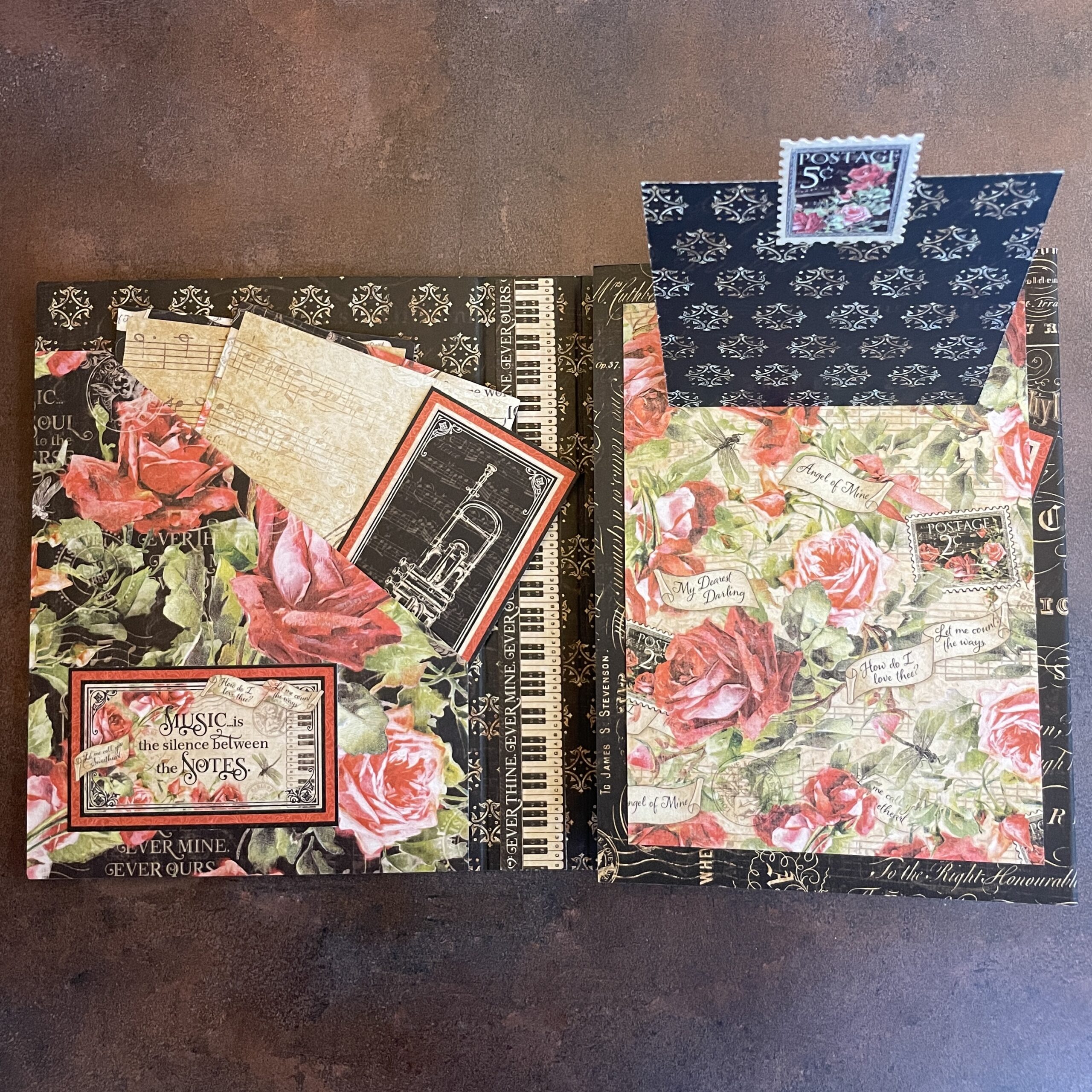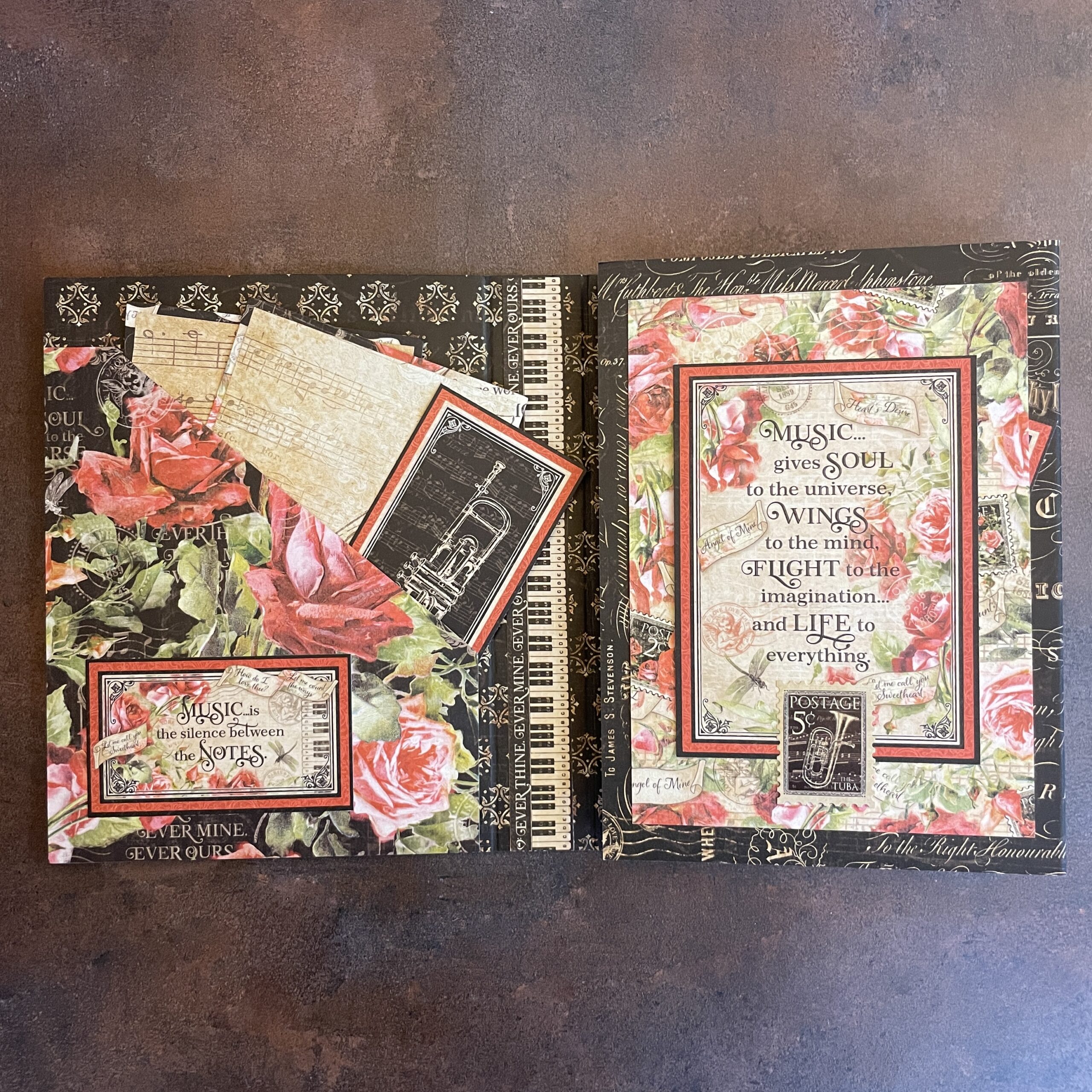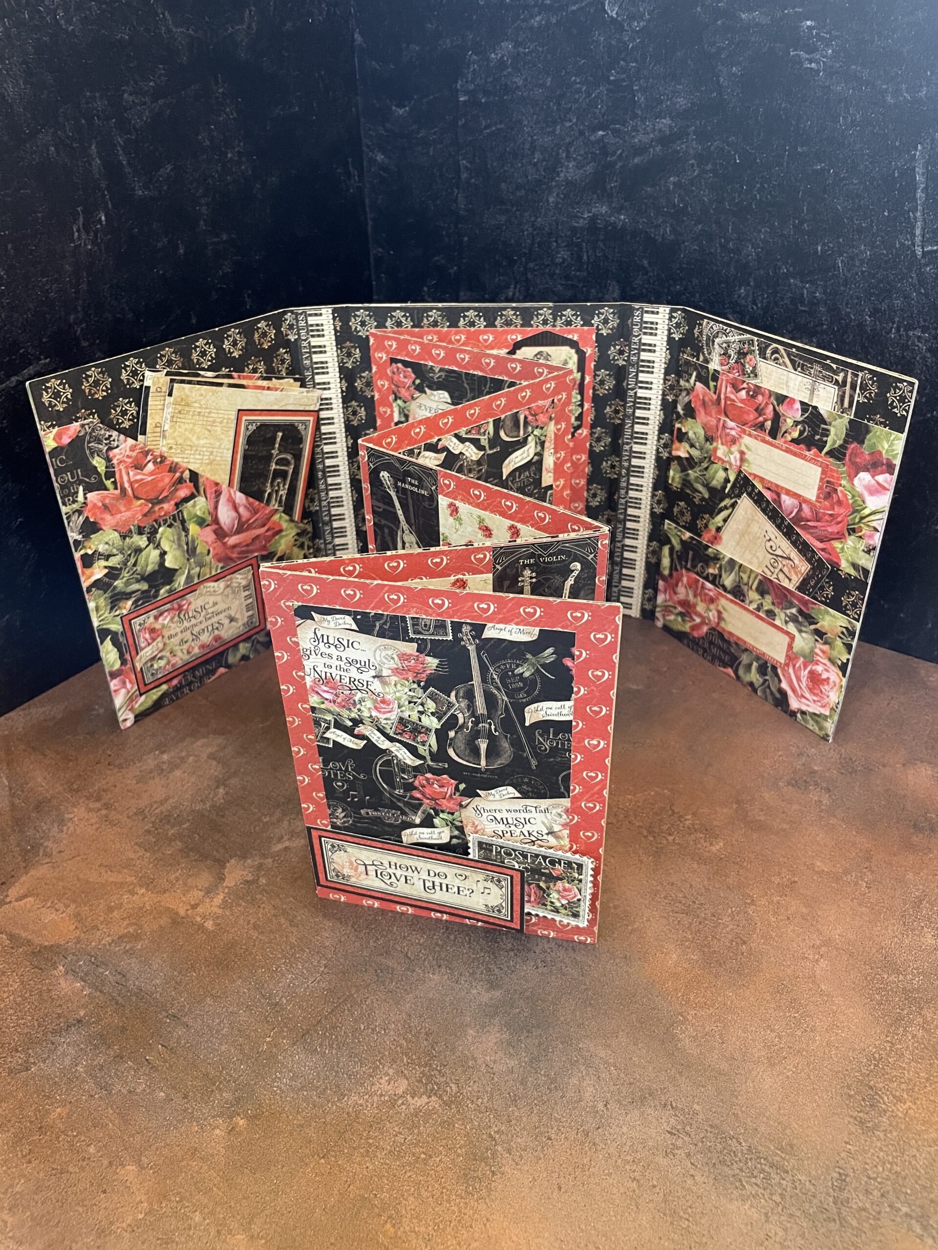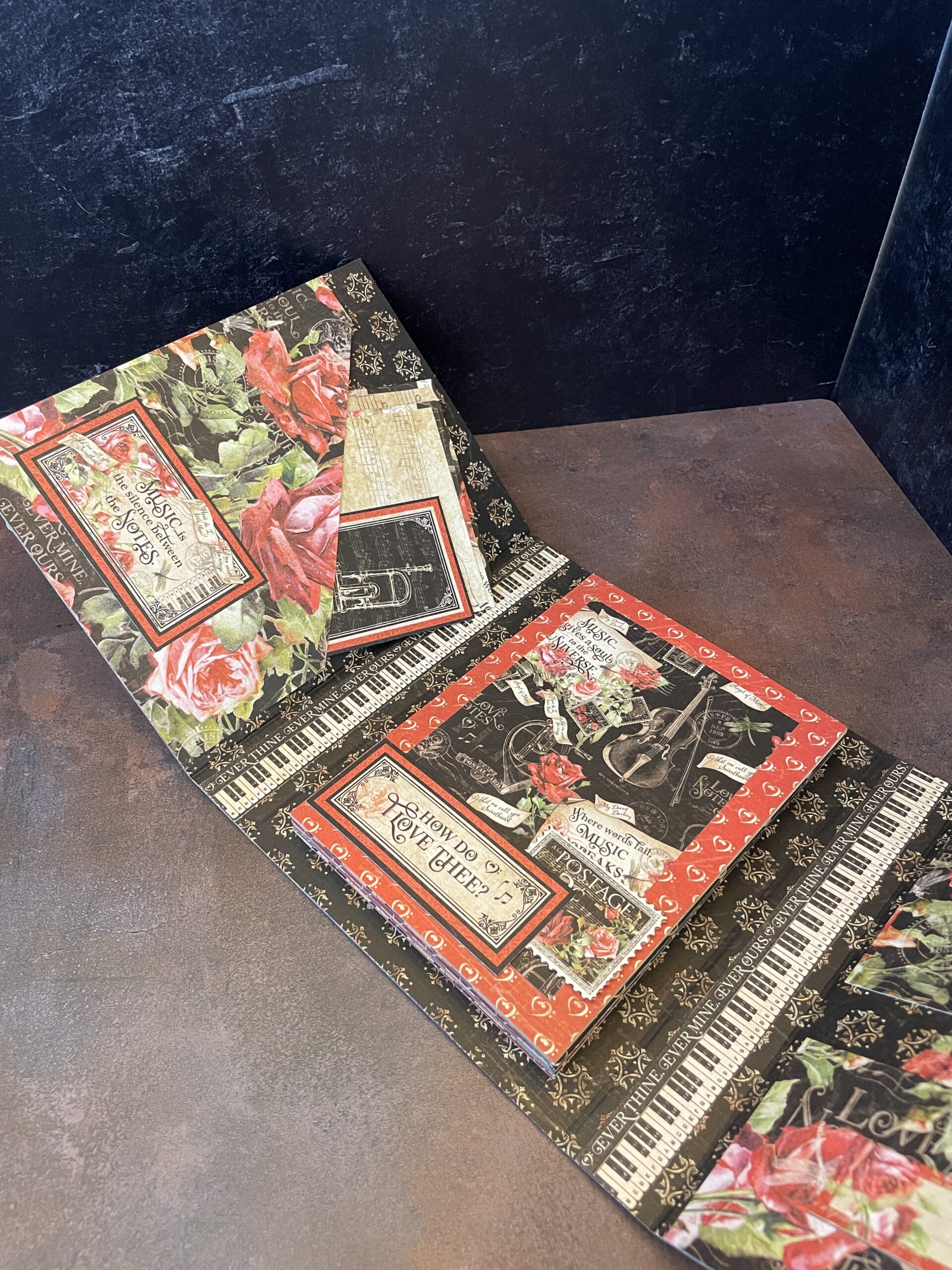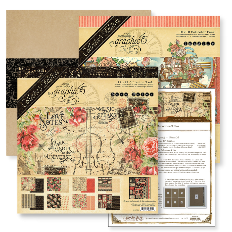 End the year on a high note with two interactive albums designed from one easy-to-follow tutorial! You will create two simple yet stunning Accordion Folios featuring two Collector’s Edition collections. From the vintage musical theme in Love Notes to iconic steampunk imagery from Imagine, your albums will be sure to impress. To make creating a breeze, both Accordion Folios feature the same layout that includes various pockets, flaps, and an expanding set of photo mats.