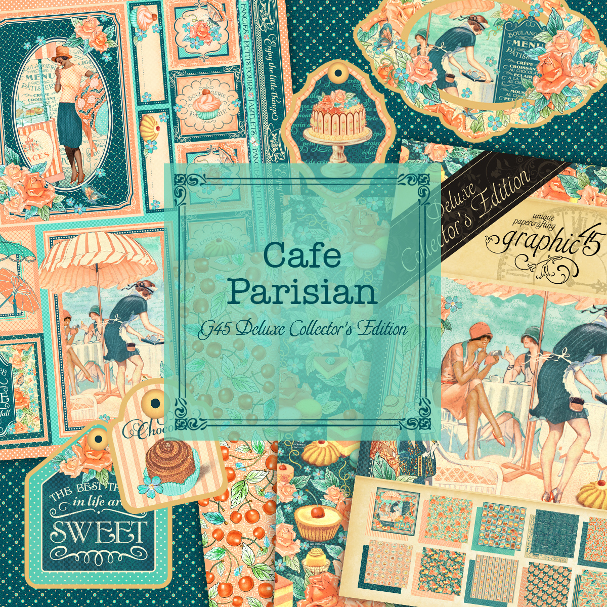 Life is sweet with this gorgeous new Graphic 45 collection that celebrates all things Paris! You will love the rich mints, cool blues, creams, pinks, and corals in Café Parisian! Sophisticated ladies, sweet petit fours, glorious fashion, and floral soufflés fill each page with European flair.