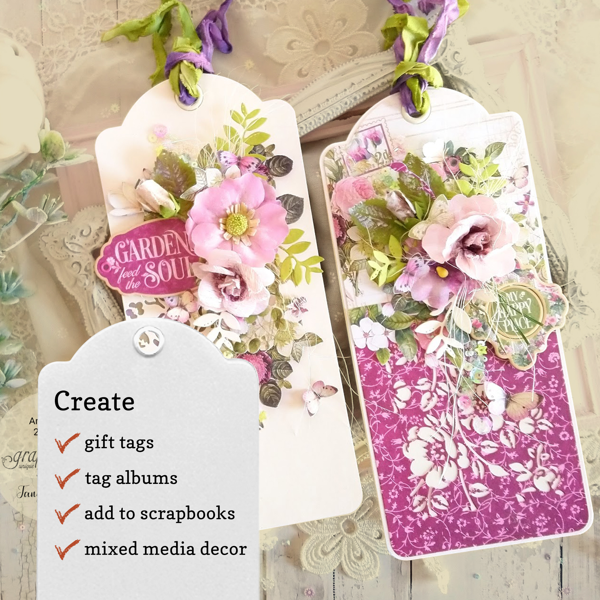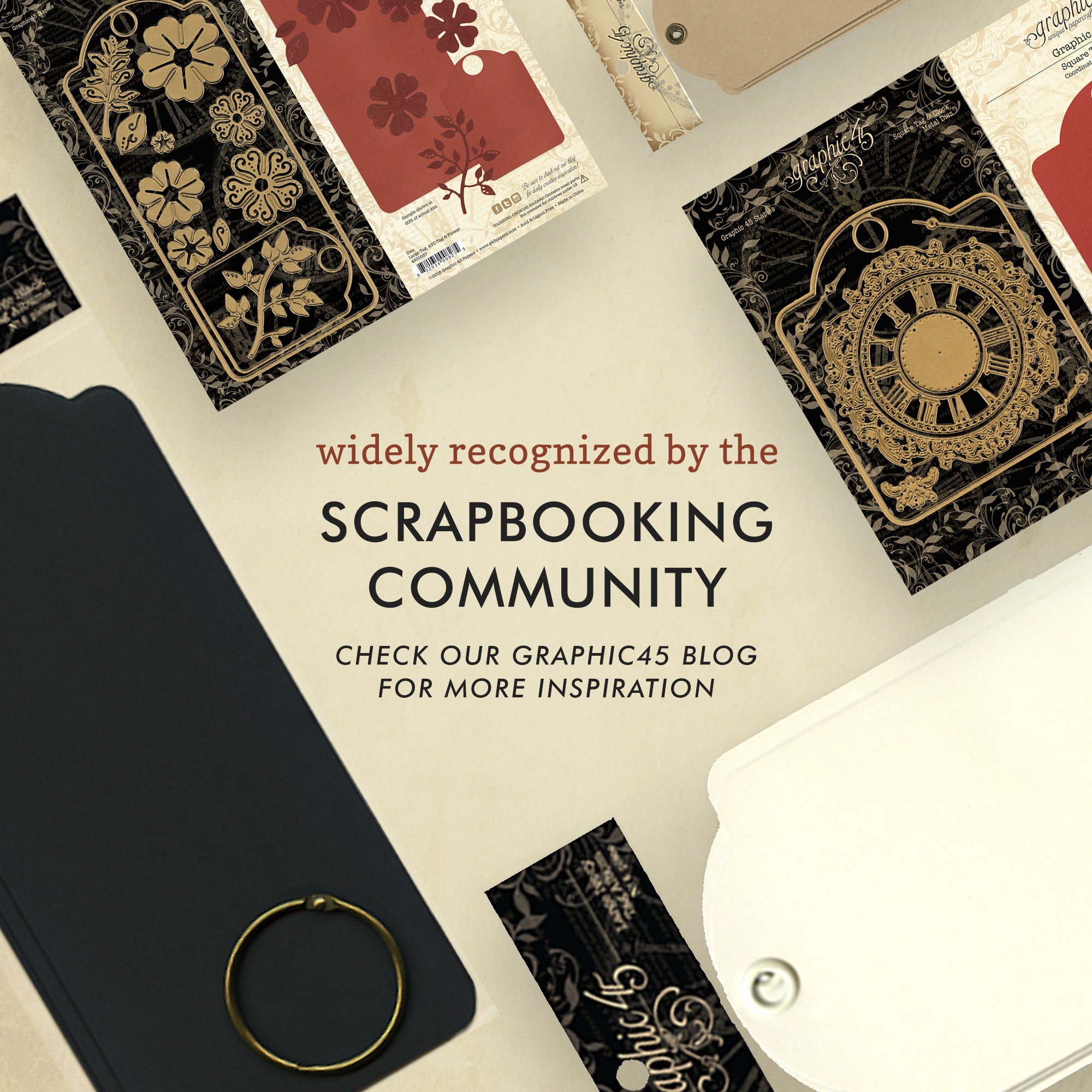 Large Tag Album, Ivory – SKU: 4500849 Six tags feature a sturdy card with grommet Including a matching binder ring 8.75 in x 3.875 in These work beautifully with any Graphic 45 paper collection and coordinate with the Large Tag, ATC Tag, and Flower Dies.