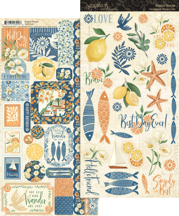 Set off on a creative journey with Scenic Route, a vibrant new paper collection inspired by the sun-soaked charm of the Mediterranean. Bursting with lively hues of orange, ultramarine blue, lemon yellow, and azure, this collection captures the joy of travel, fresh flavors, and coastal beauty.