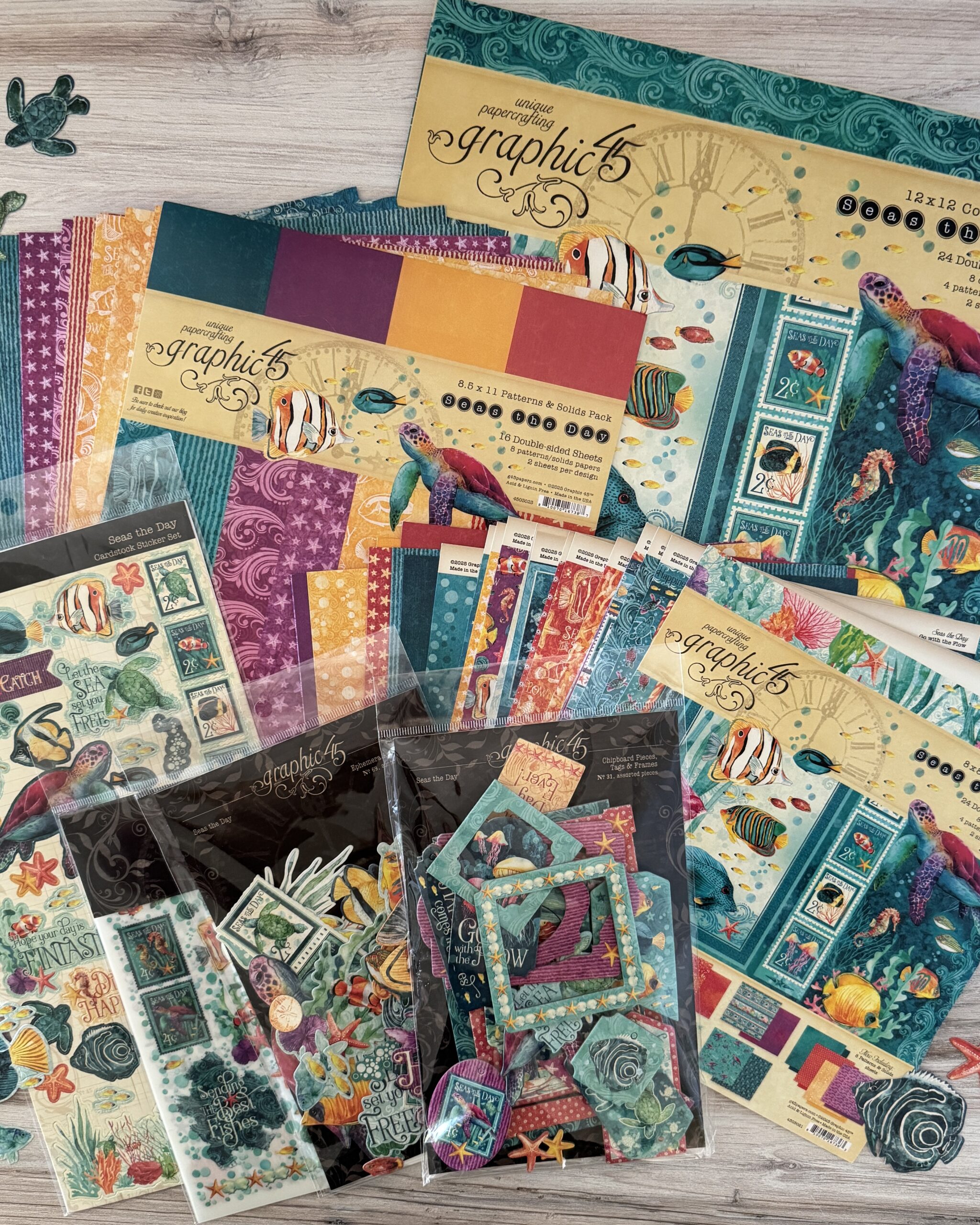Make a splash with Graphic 45’s Seas the Day Paper Collection – a vibrant under-the-sea adventure bursting with tropical charm and oceanic whimsy. Dive into a world of colorful coral reefs, playful turtles, and exotic fish set against a sun-drenched palette of turquoise blue, purple violet, sunshine yellow, and coral red.