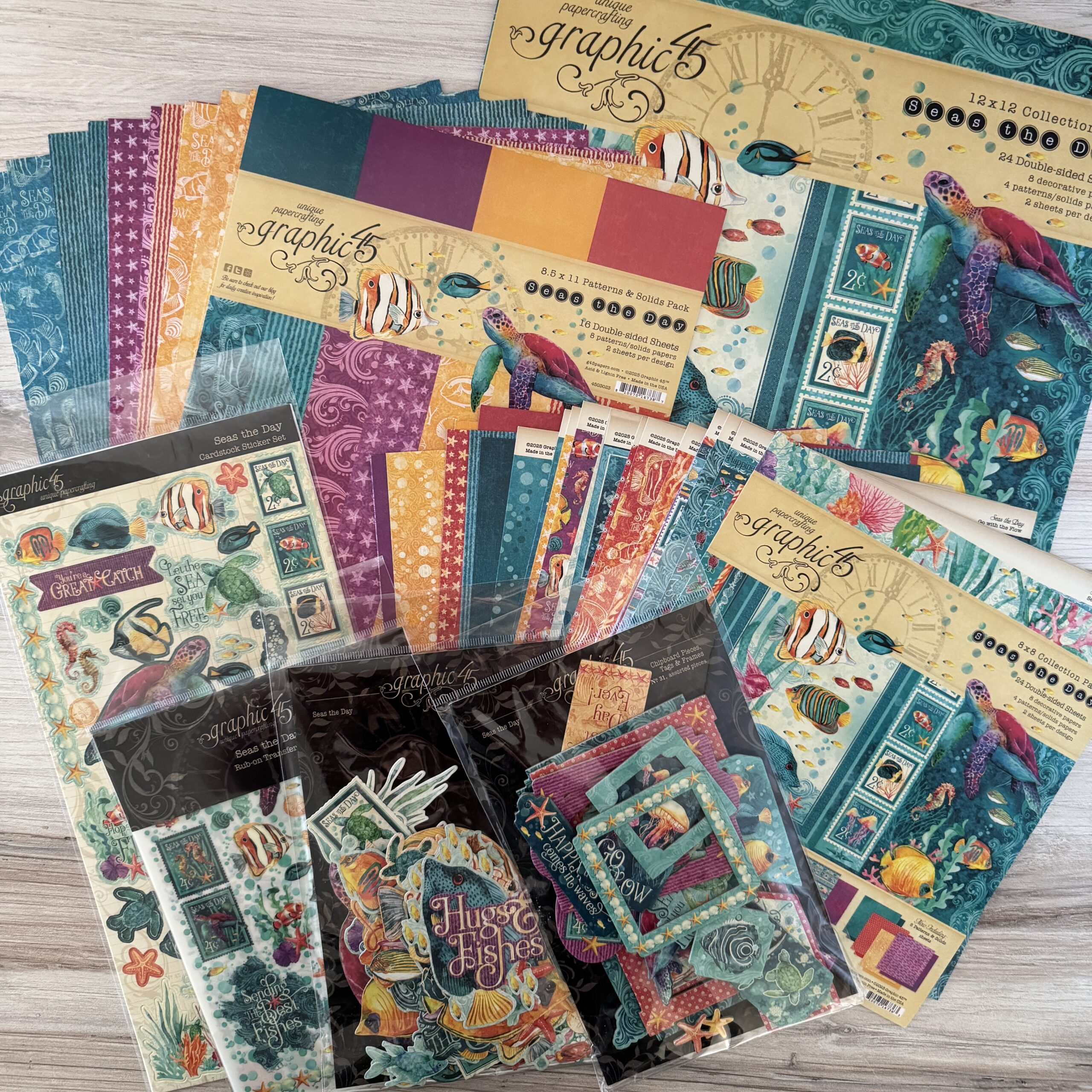 Make a splash with Graphic 45’s Seas the Day Paper Collection – a vibrant under-the-sea adventure bursting with tropical charm and oceanic whimsy. Dive into a world of colorful coral reefs, playful turtles, and exotic fish set against a sun-drenched palette of turquoise blue, purple violet, sunshine yellow, and coral red.