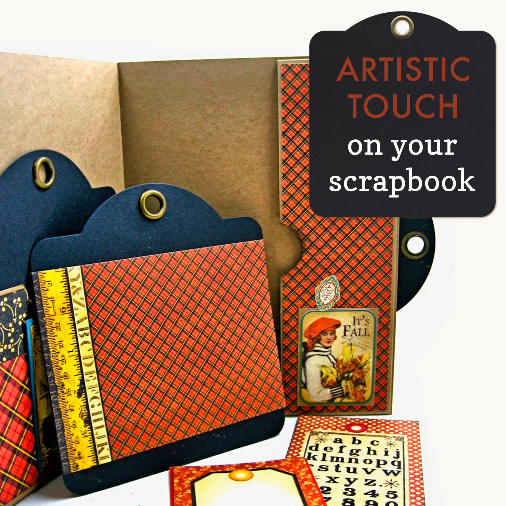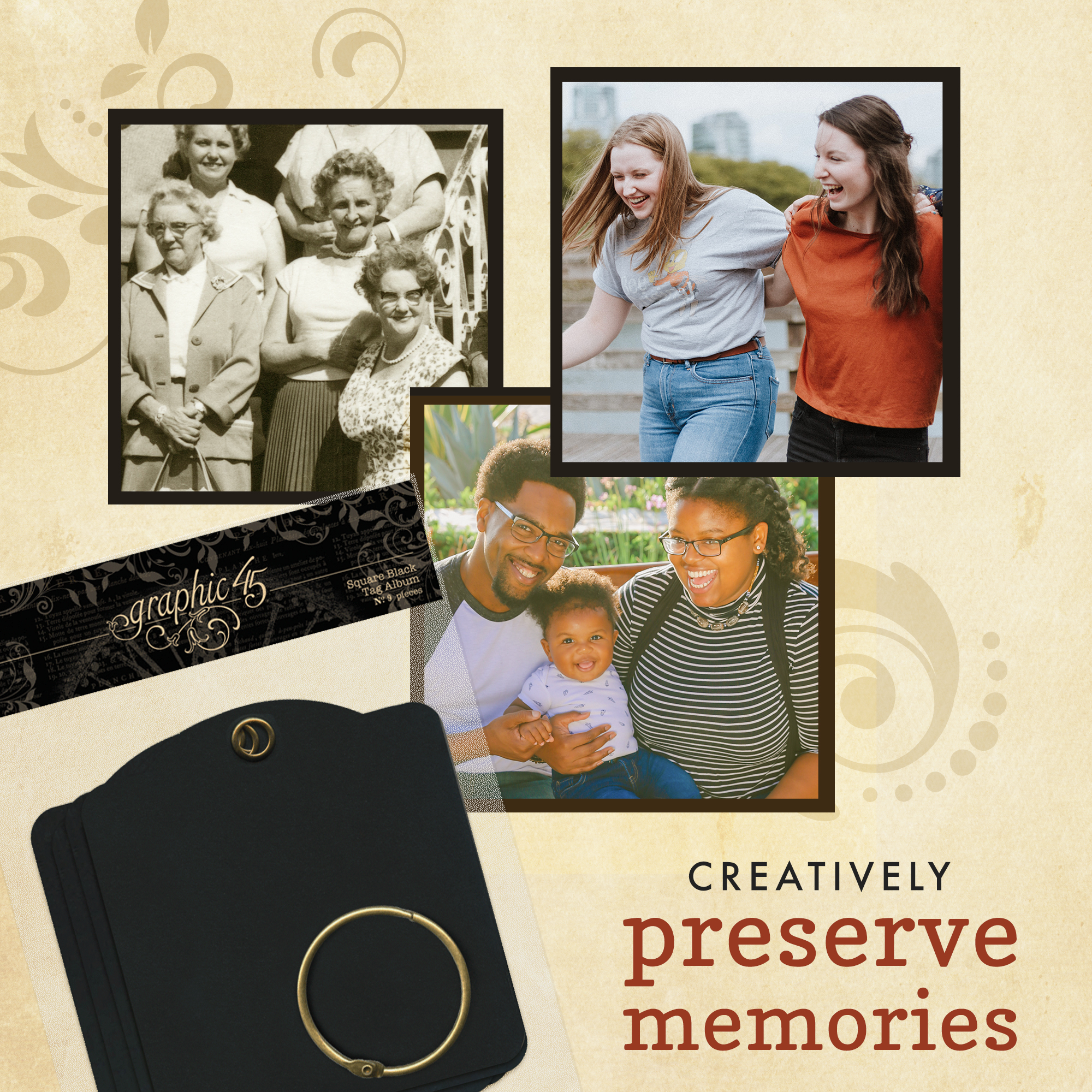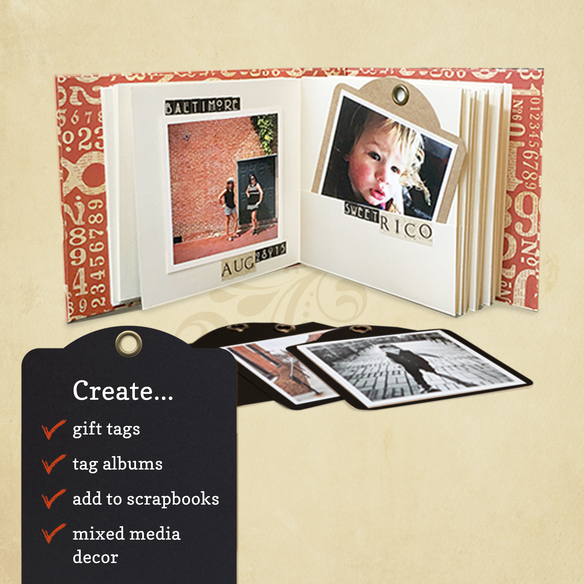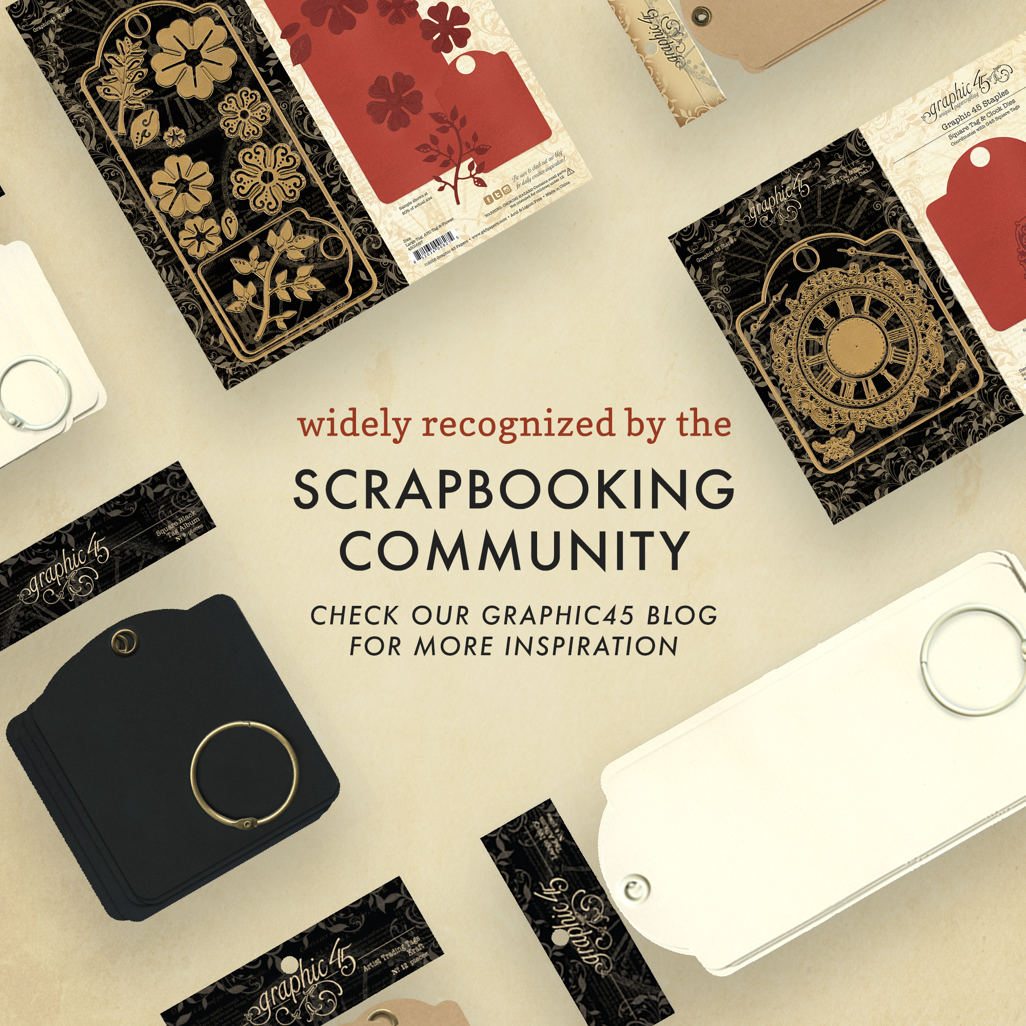 These work beautifully with any Graphic 45 paper collection, as well as 4 in x 4 in photos, and coordinate with Square Tag & Clock Dies.