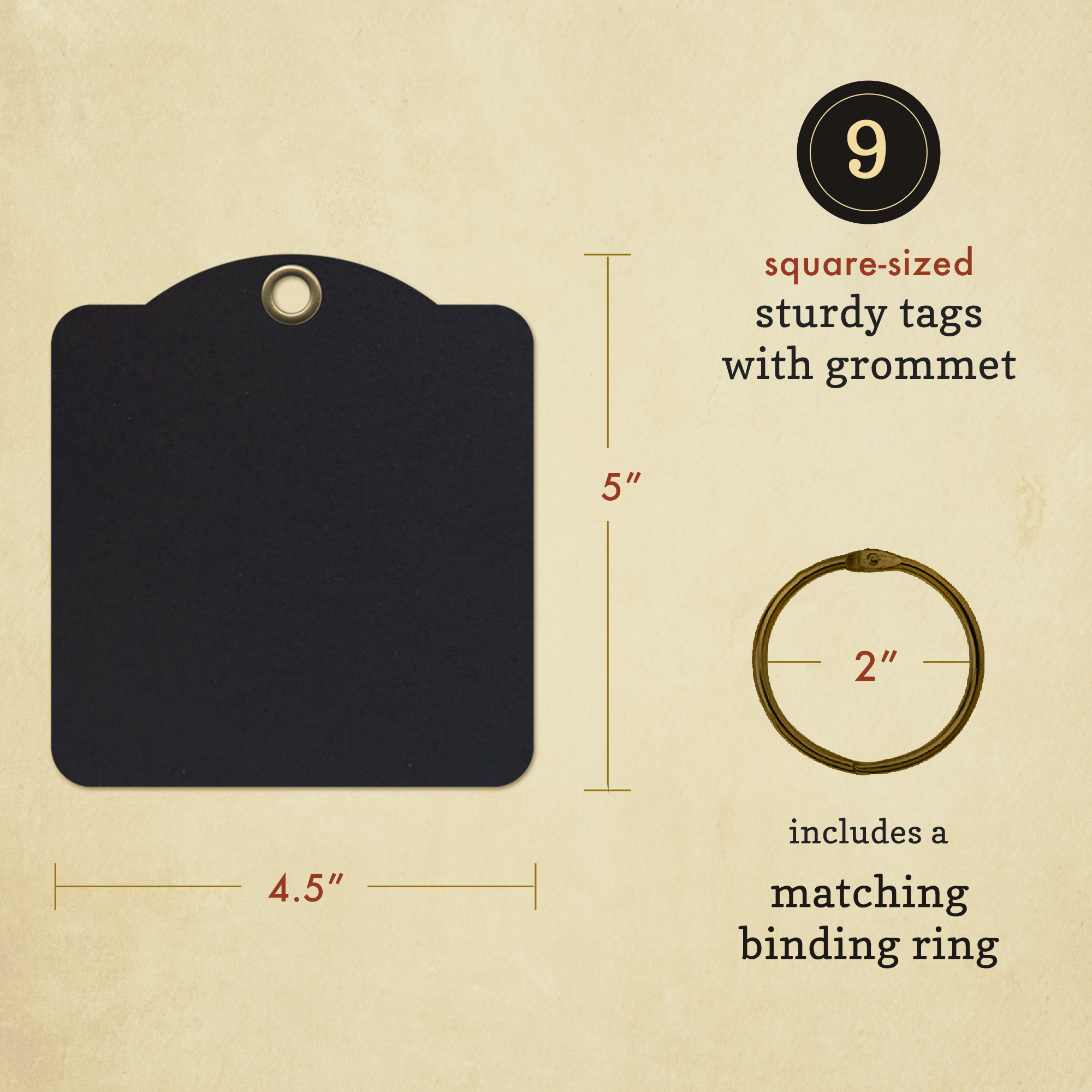 Nine tags feature a sturdy card with grommet
