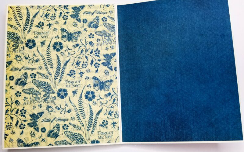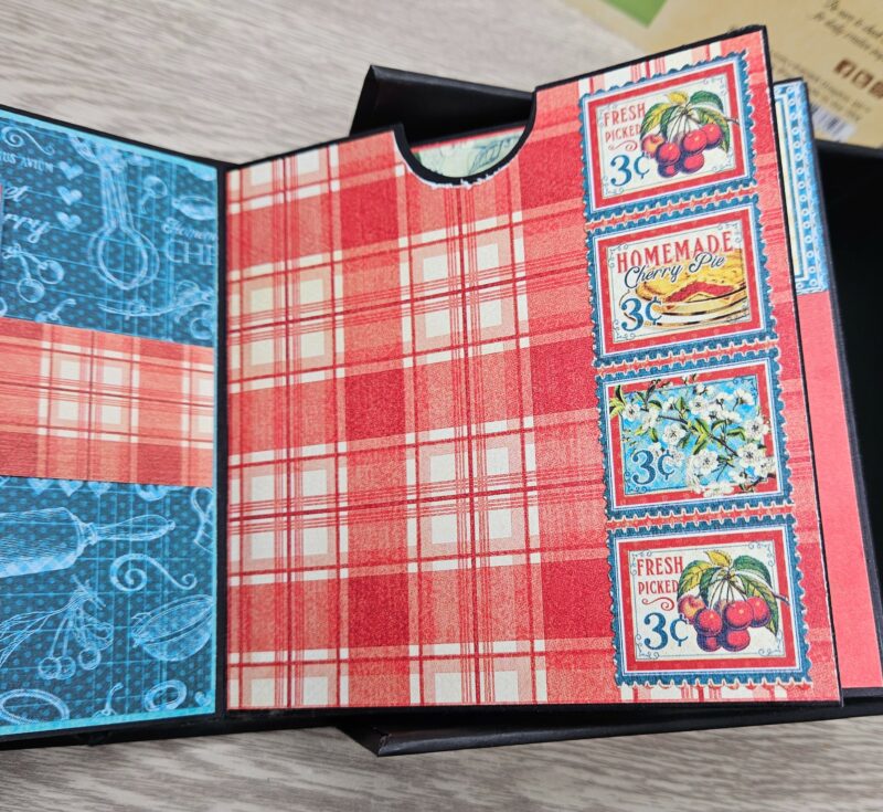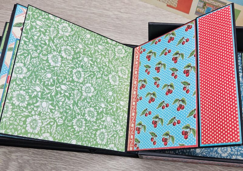 In the video I will show you a couple of card styles made from scraps as well. A small folio was also made. Originally I wanted to put a chipboard cover on my album inside the box and once I did I preferred it without it. Rather than tossing it, I added a box pocket and created a small notebook to tuck inside.