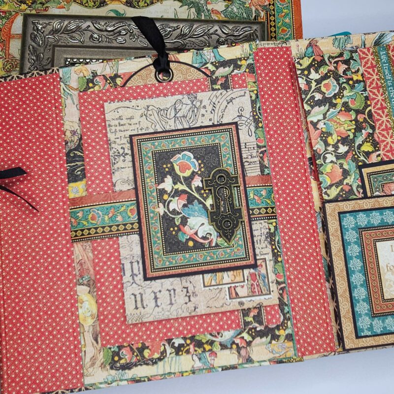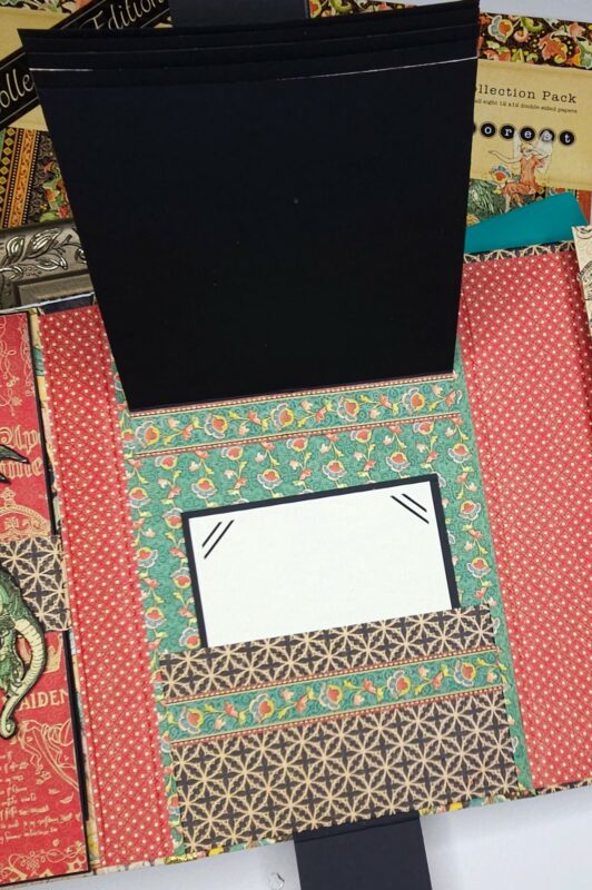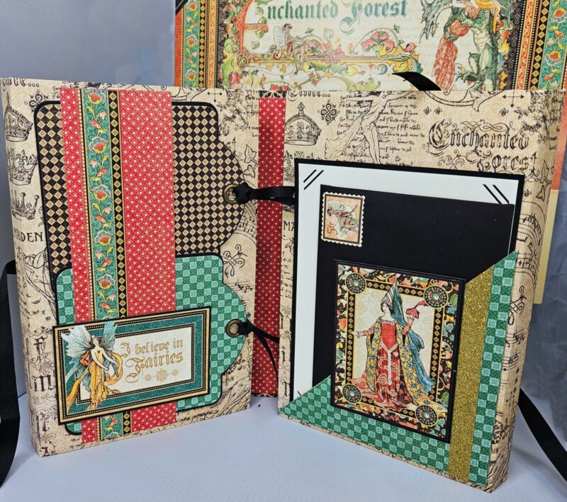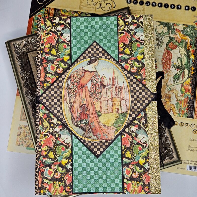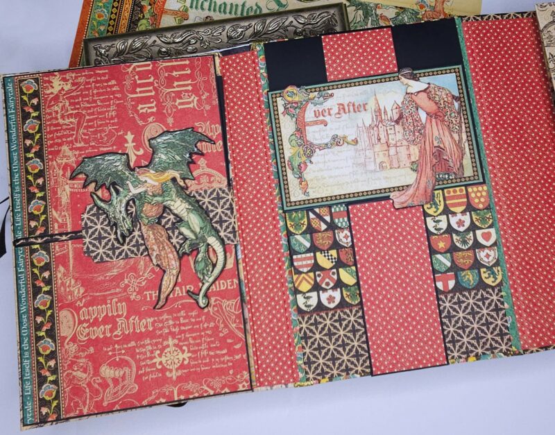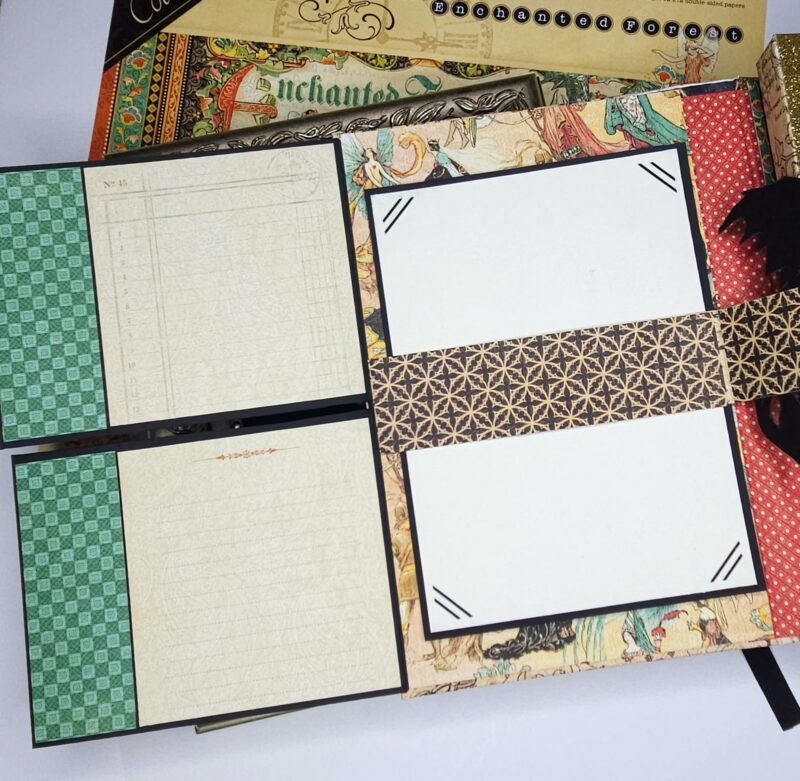 The flap fronts are covered using Exquisite Epoch (B). For the backs as explained in my walkthrough, I have used journaling cards from an older collection cut down and scrap strips on the sides. Under the flaps, I created a 1 ½” belly band that wraps forward and has magnets to secure the flaps. The dragon image was fussy cut from Enchanted Forest (A) after it was fussy cut from the paper and adhered to black chipboard. A 5”X7” photo matte with picture slots was created to place in the belly band under the flaps as well.