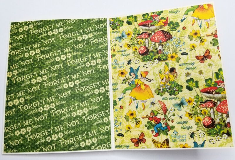 For the first panel inside, I have done something similar to the original. Cut a piece Brilliant Gem (B) 2 ½”X8 ¾”. Adhere as a belly band by only placing adhesive on the top and bottom and place on the panel approximately 1” from the left side.Cut a piece of black chipboard to 4”X2 ⅝” and adhere the cut apart “I Believe in Fairies” from Gilded Grandeur (A). Cut a border saved from the Enchanted Forest (A) to 8 ¾” and add to the strip off center.Add adhesive to the cut apart on chipboard to adhere it only to the belly band. If you place it on the belly band and use a pencil to make small lines to follow it is easier to ensure it does not glue down to the page. For this belly band I also covered two G45 black square tags in paper and slipped them in the pocket. The black trim was also used on these.