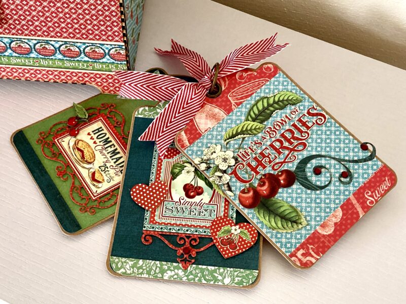 Hi crafty friends. It’s Kristine and this is my last post as a Graphic 45 Brand Ambassador. It has been a wonderful two years and I will miss designing for Graphic 45. This month, I will be completing a #G45Feature project, which will showcase how you can use an entire collection to create an amazing project (or three!). For my last project as a Brand Ambassador, I used the Life’s a Bowl of Cherries collection to create a recipe box with a matching recipe book. The box and book both are made from wood cut on a laser cutter. I also made a set of three tags just for fun!