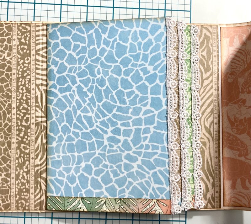 Steps 20-21: Follow steps 20-21 in the Club G45 tutorial using the b-side of Creatures Great and Small. Then cut three pieces of thin white trim to 7” each and adhere to the right edge of each page on the front side.