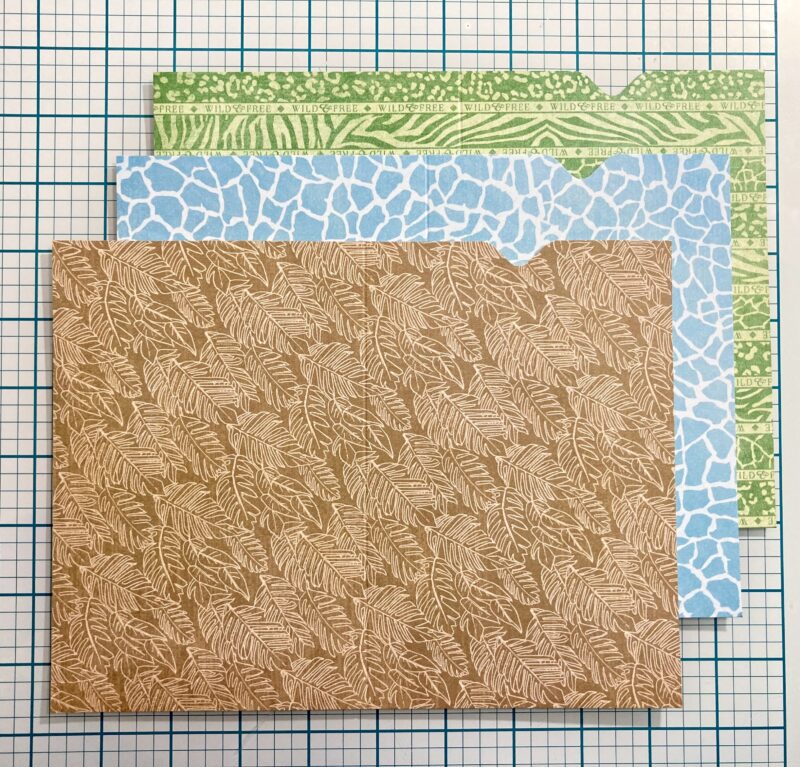 Steps 17-19: Follow steps 17-19 in the Club G45 tutorial for measurements using brown, blue, and green Patterns & Solids papers. I used my envelope punch board instead of a circle punch to notch my pockets.