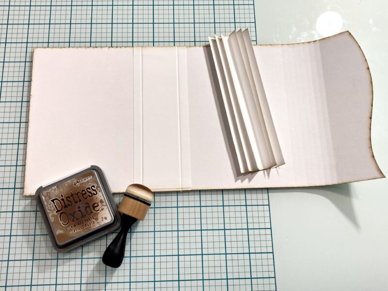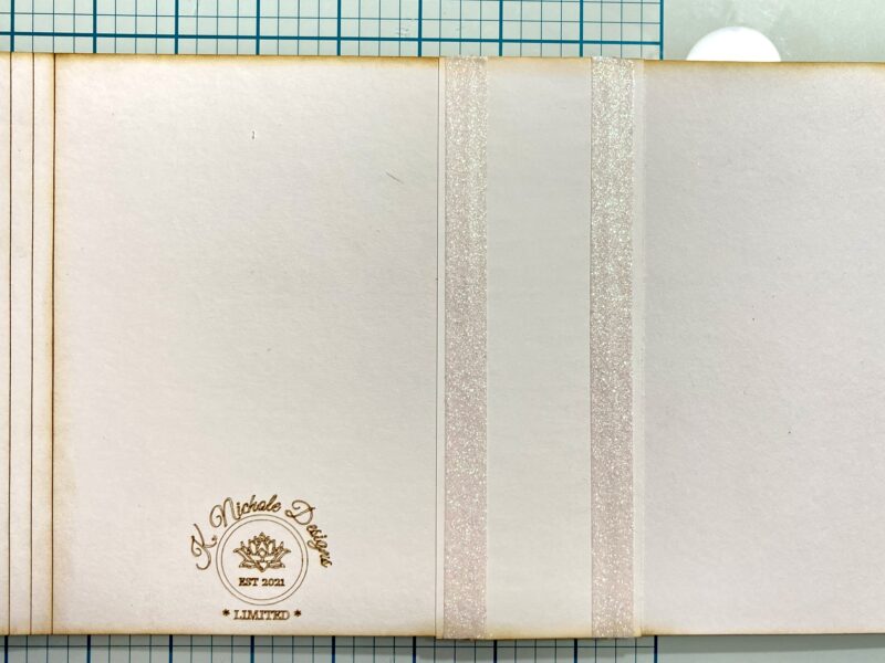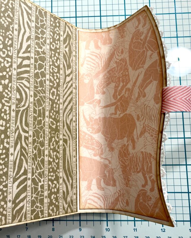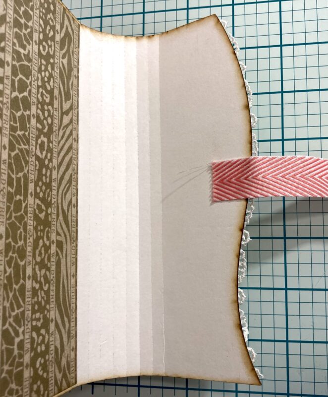 Step 13: Cut a piece of Graphic 45 trim to 11” and adhere to the center of the curve in the album from the inside.