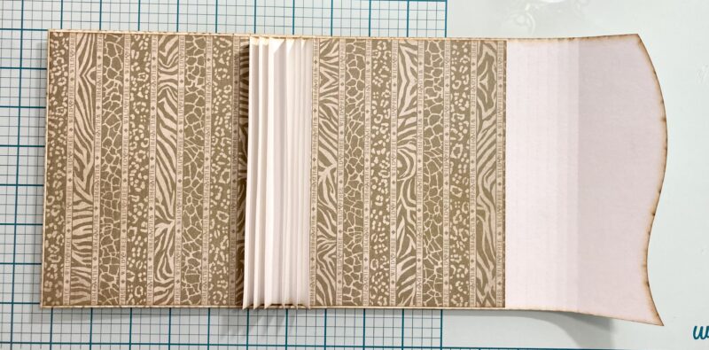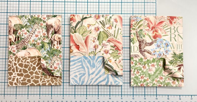 Step 15: Follow step 15 in the Club G45 tutorial using the b-side of Creatures Great and Small. I used my envelope punch board instead of a circle punch to notch my pocket. Then add a large journaling card to each pocket.