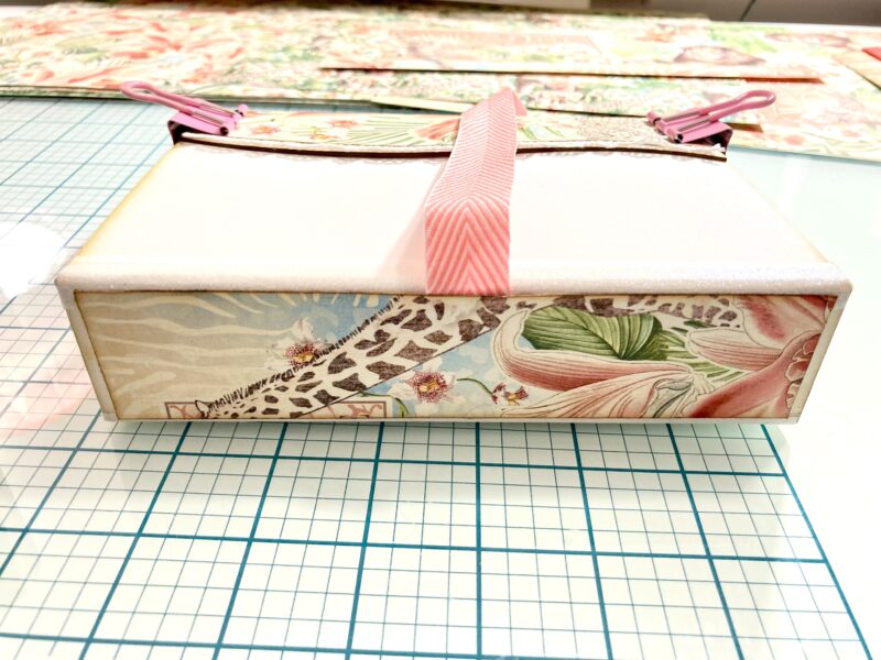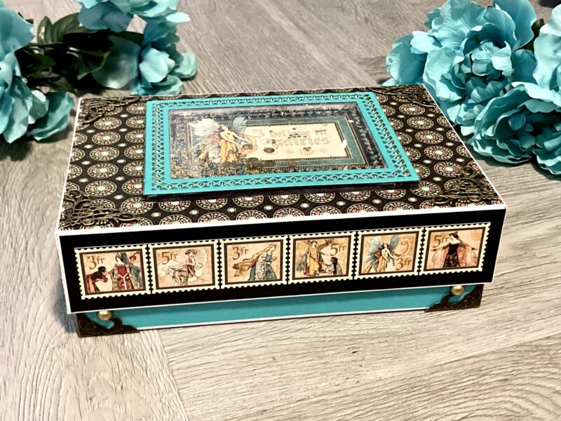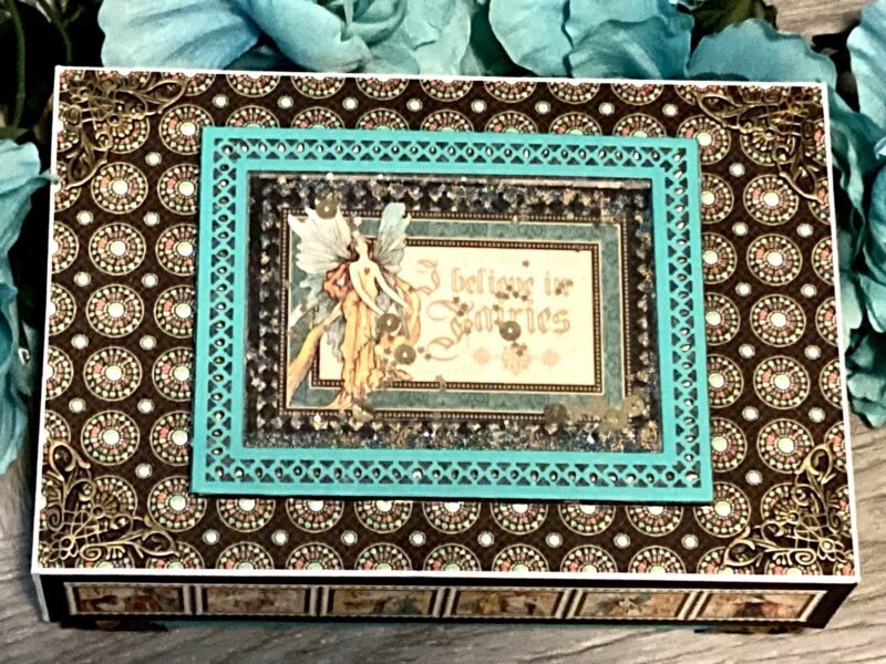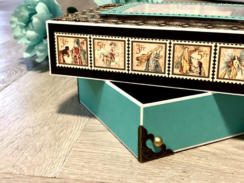 The metal corners on the top of the box were a bit hard to see on the darker paper I chose from the Enchanted Forest collection. So I lightly brushed them with bronze distress paint to brighten them up just a bit!