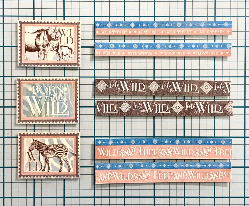 Step 29: From Born to Be Wild, cut the three stamp images at the top and the border strips from the page. Trim the border strips so there are three sets measuring 4 ½” in length.