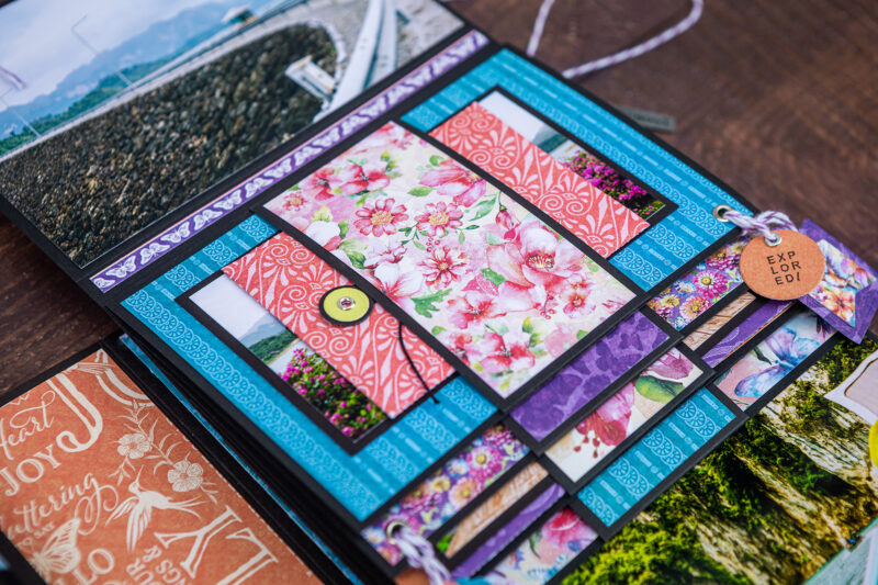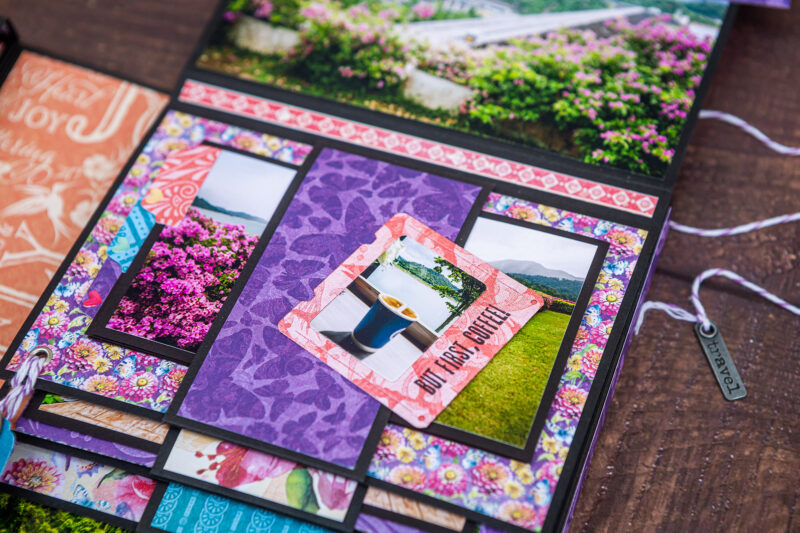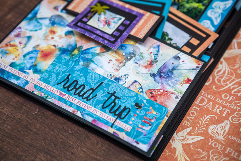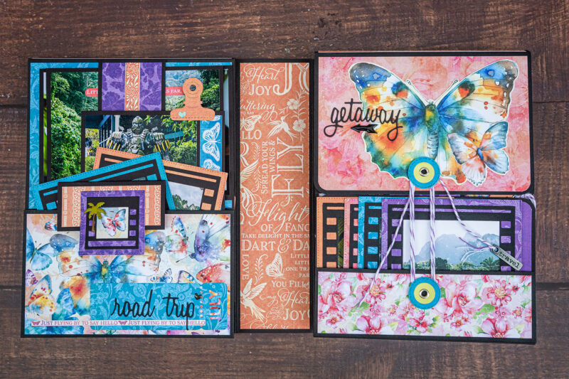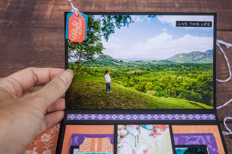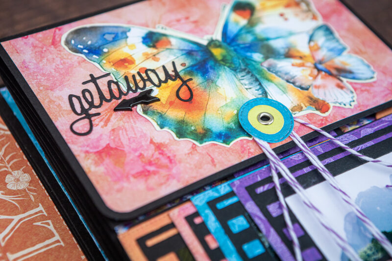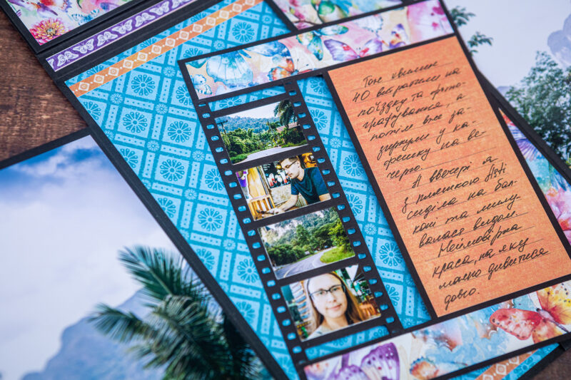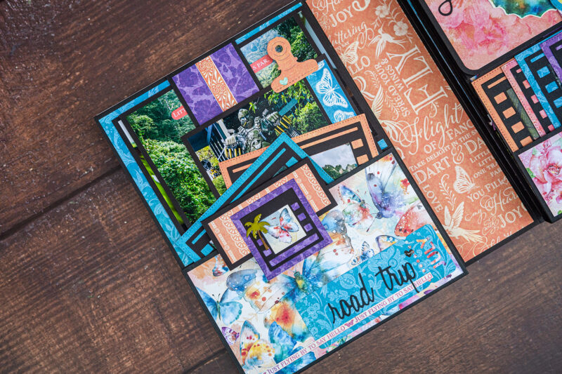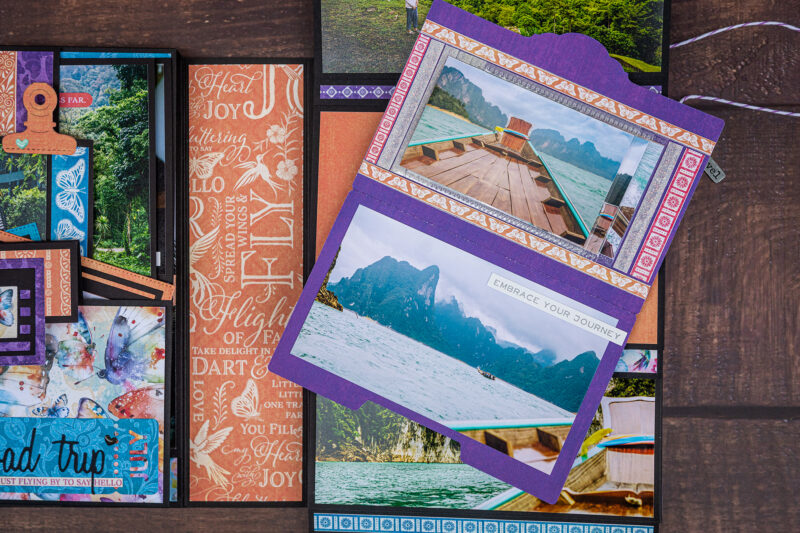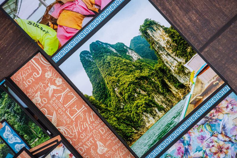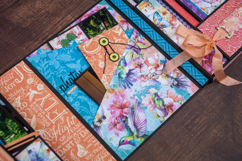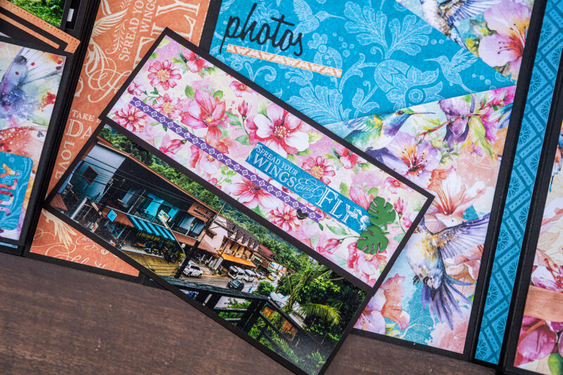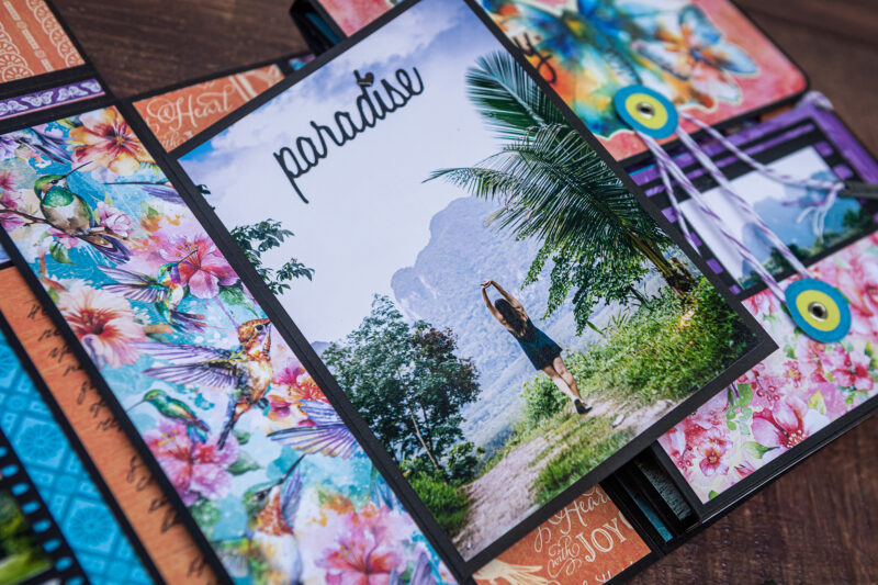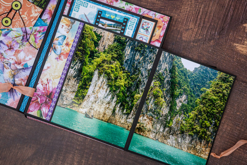 Today I want to show you my new photo folio. I have used the bright and juicy Flight of Fancy Collection for this project. I crafted this album for photos taken during our Khao Sok National Park trip. And this collection perfectly emphasized the beauty of this place. I’ve made a lot of fun inserts using my favorite Graphic 45 dies (folder, policy and pocket dies).Â