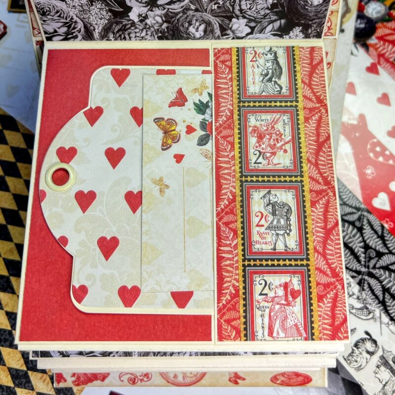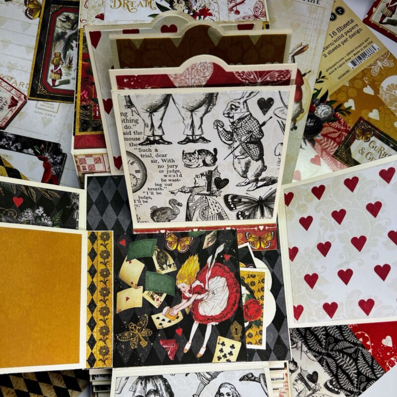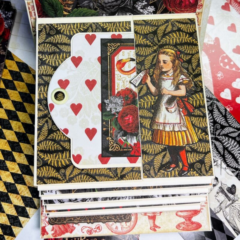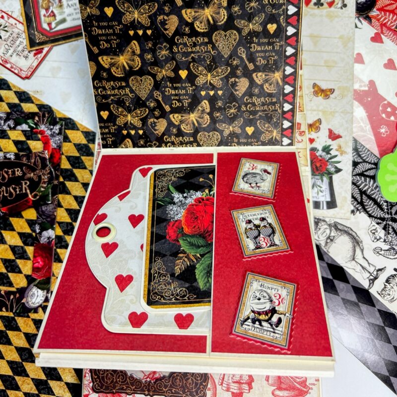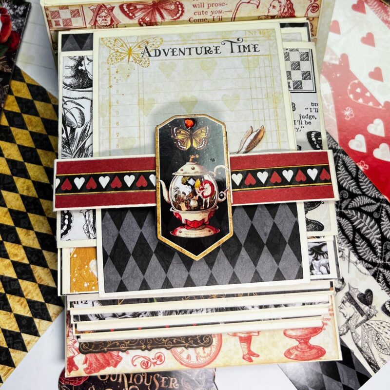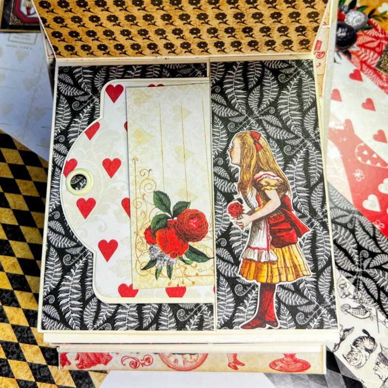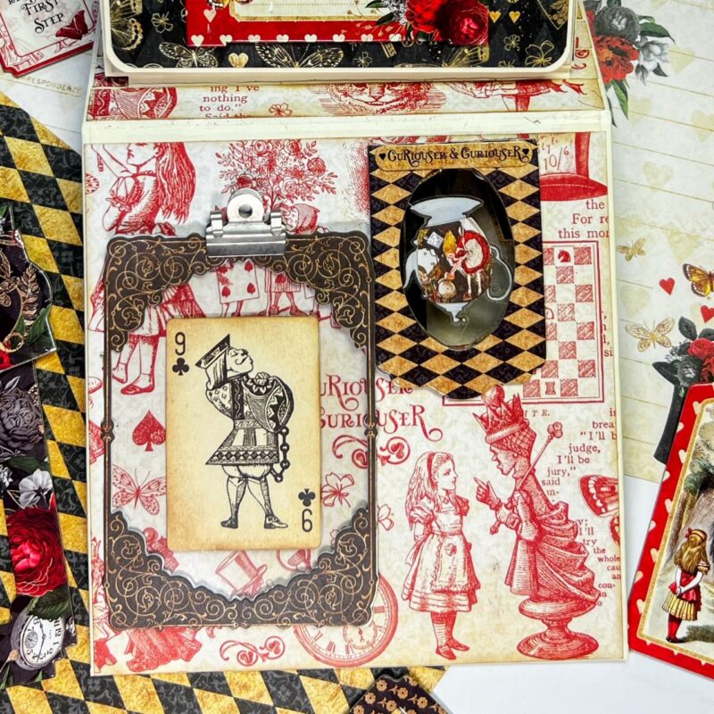 The Curiouser & Curiouser paper collection is perfect for creating a whimsical Alice in Wonderland-inspired suitcase mini album and using the Square Tag and Pocket Wrap Around Album as the base adds a lot of structure and interactive elements to the project.