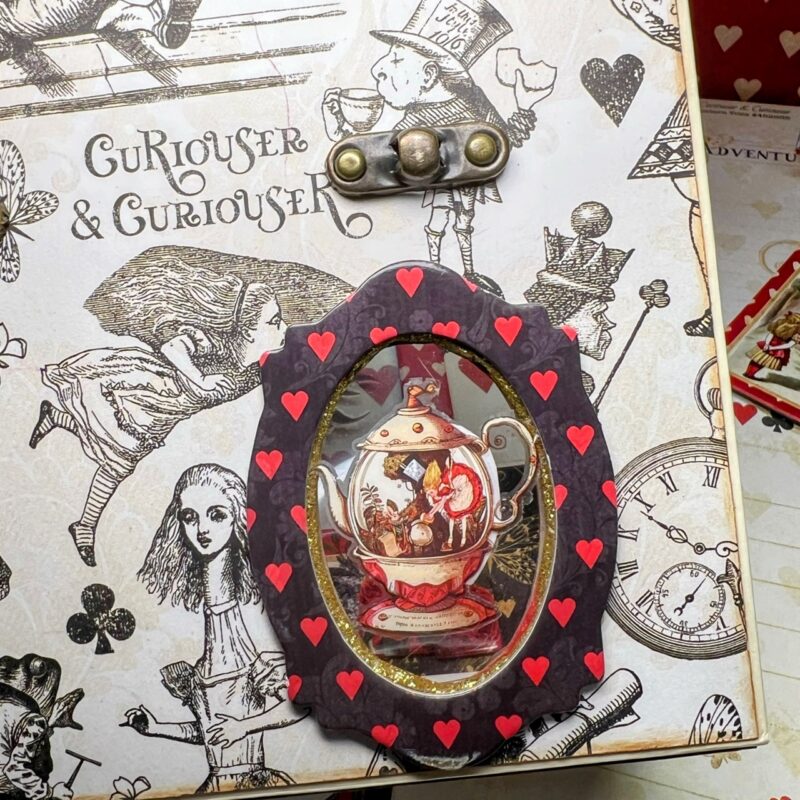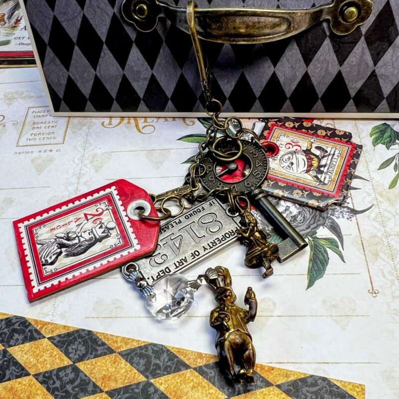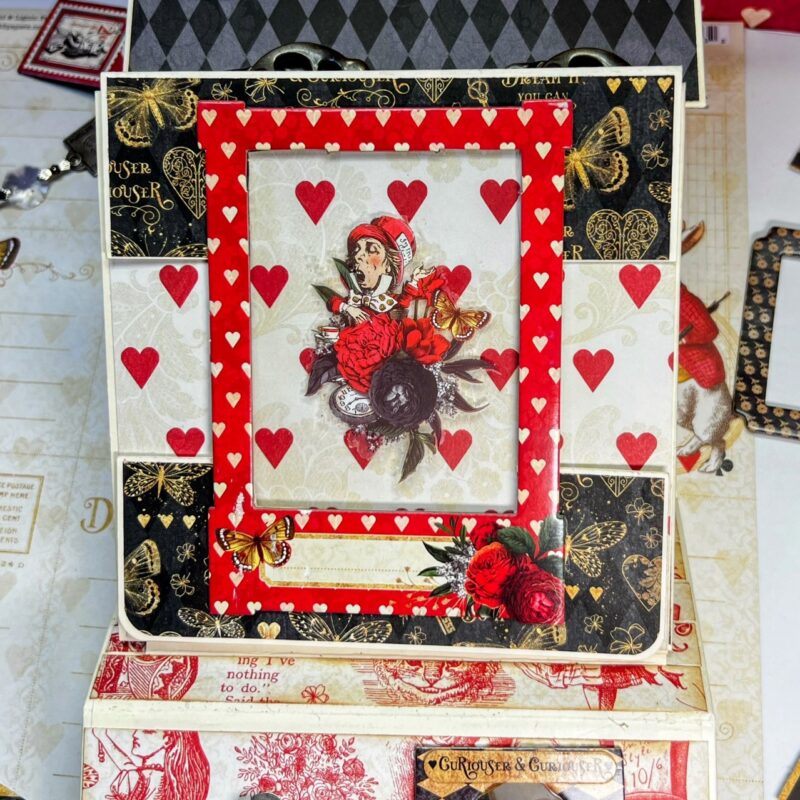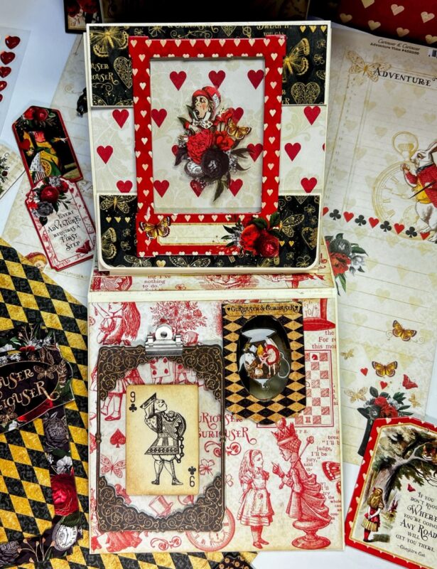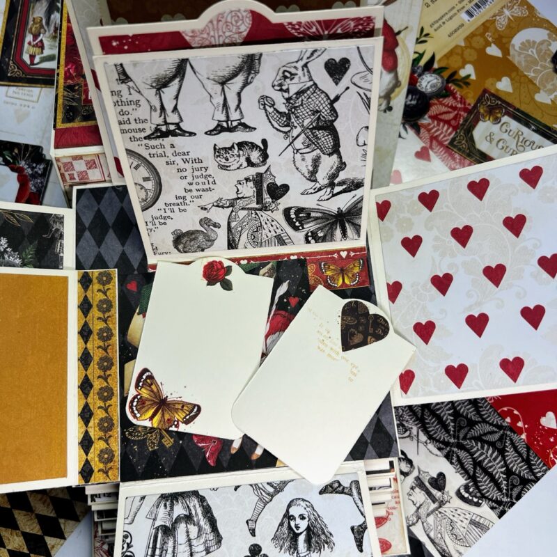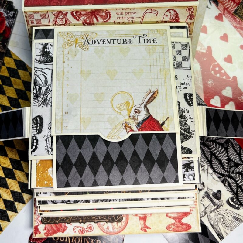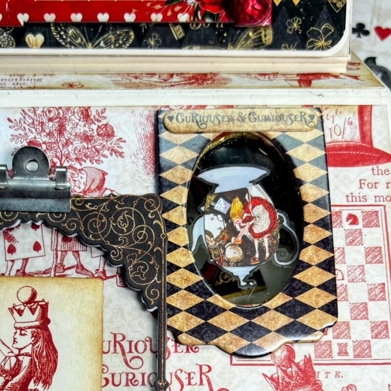 The Curiouser & Curiouser paper collection is perfect for creating a whimsical Alice in Wonderland-inspired suitcase mini album and using the Square Tag and Pocket Wrap Around Album as the base adds a lot of structure and interactive elements to the project.