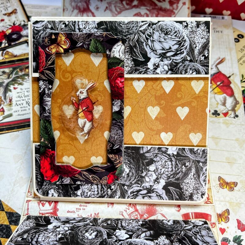 I added four pull-out Window-style pages to add an element of surprise and intrigue, just like discovering new things in Alice’s Wonderland. My window pages feature the chipboard frames, and Rub-on transfers i used on top of transparency. That way, your photos will peak through.